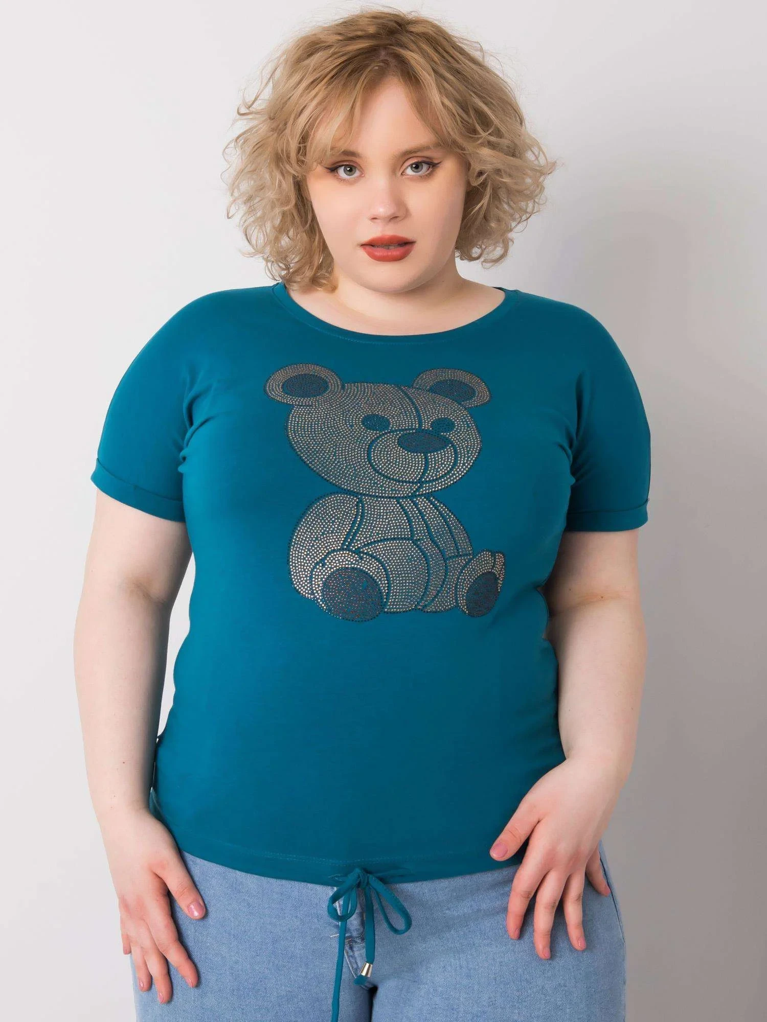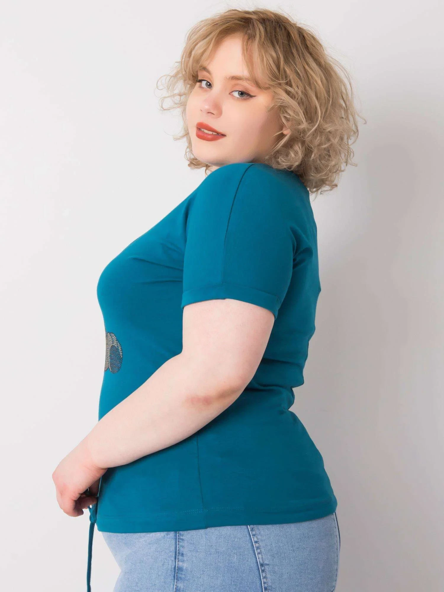 Mořsky modrá plus size halenka s kravatami.