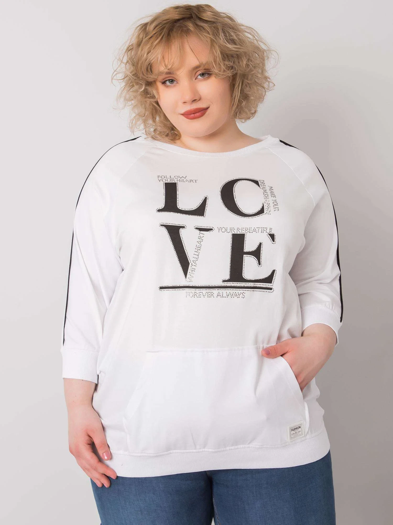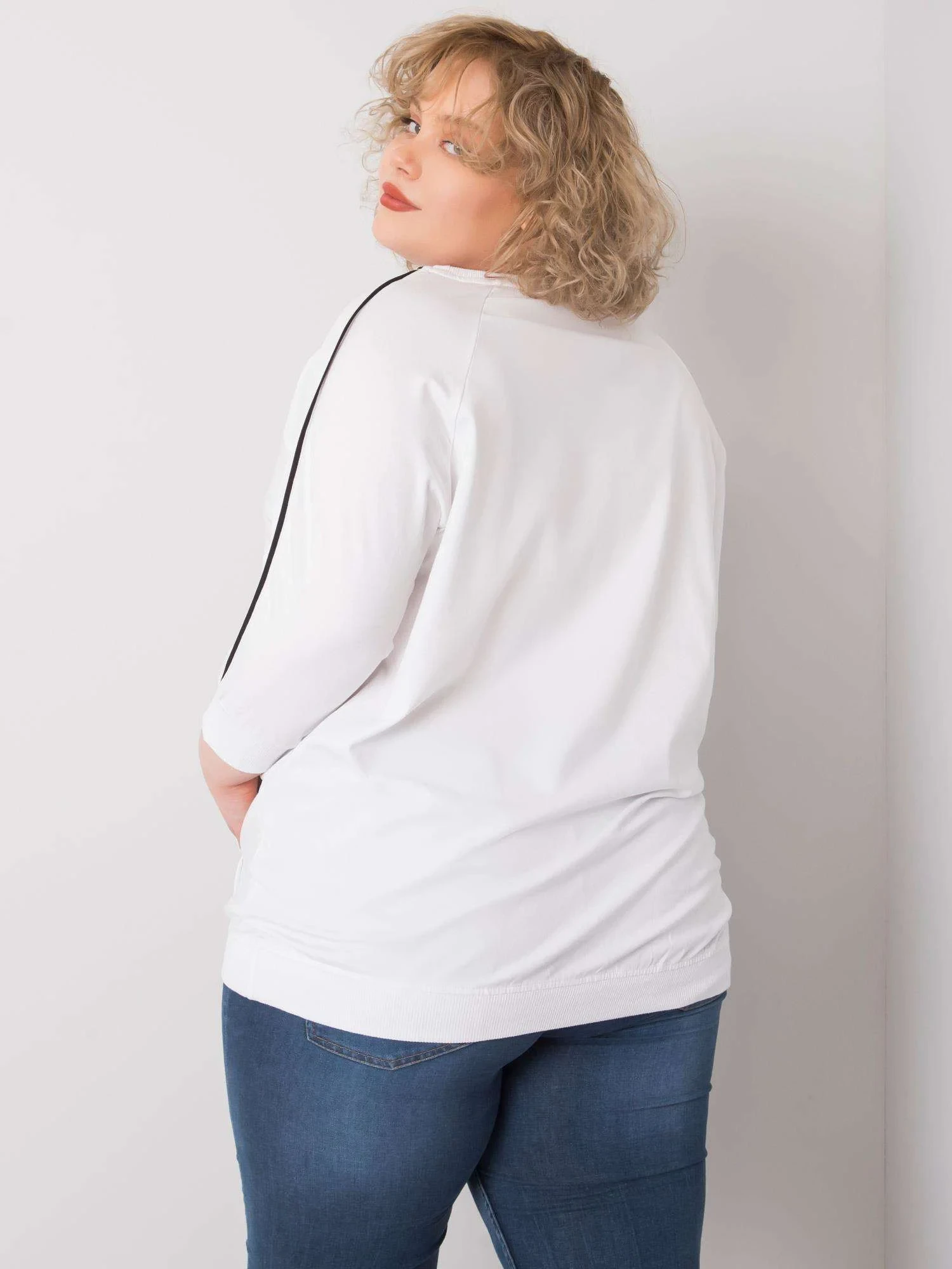 Bílá plus size halenka s kapsami a aplikacemi.