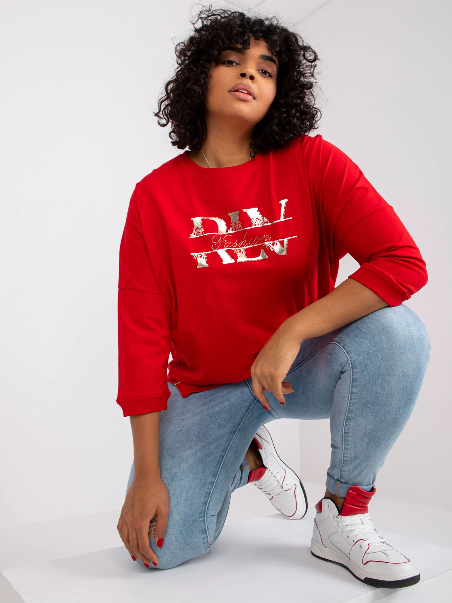 Modelka má na sobě jednu velikost. Rozměry modelky: výška 175 cm, poprsí 103 cm, pas 86 cm, boky 118 cm.