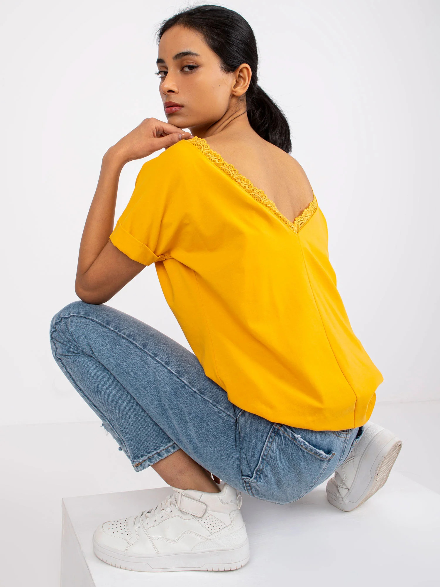Modelka má na sobě velikost S. Rozměry modelky: výška 172 cm, poprsí 90 cm, pas 62 cm, boky 89 cm.
