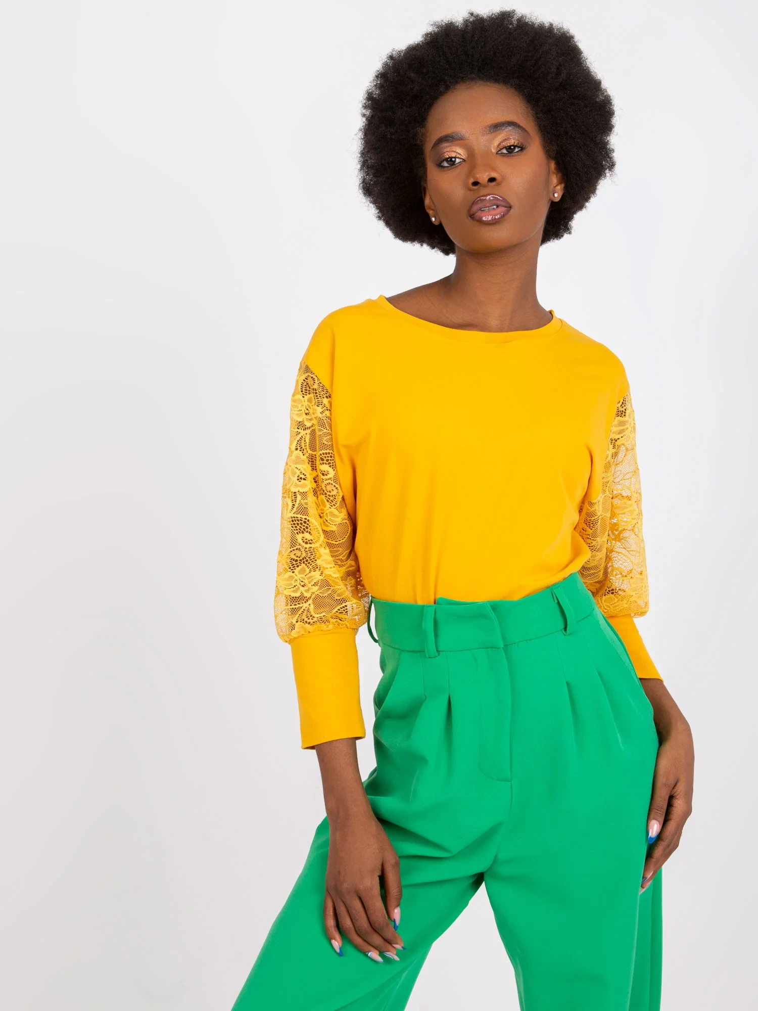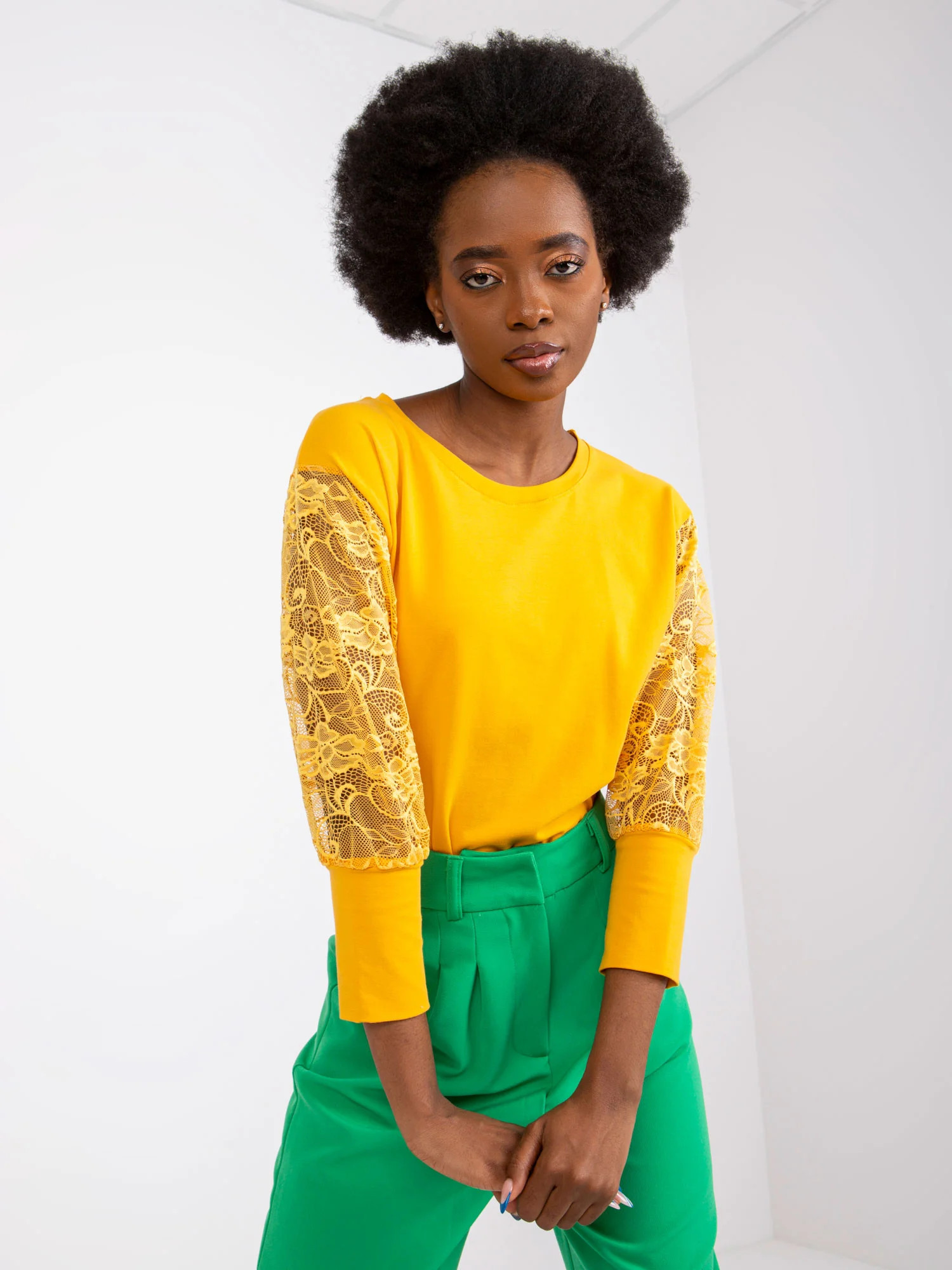Modelka má na sobě velikost S. Rozměry modelky: výška 162 cm, poprsí 80 cm, pas 63 cm, boky 80 cm.