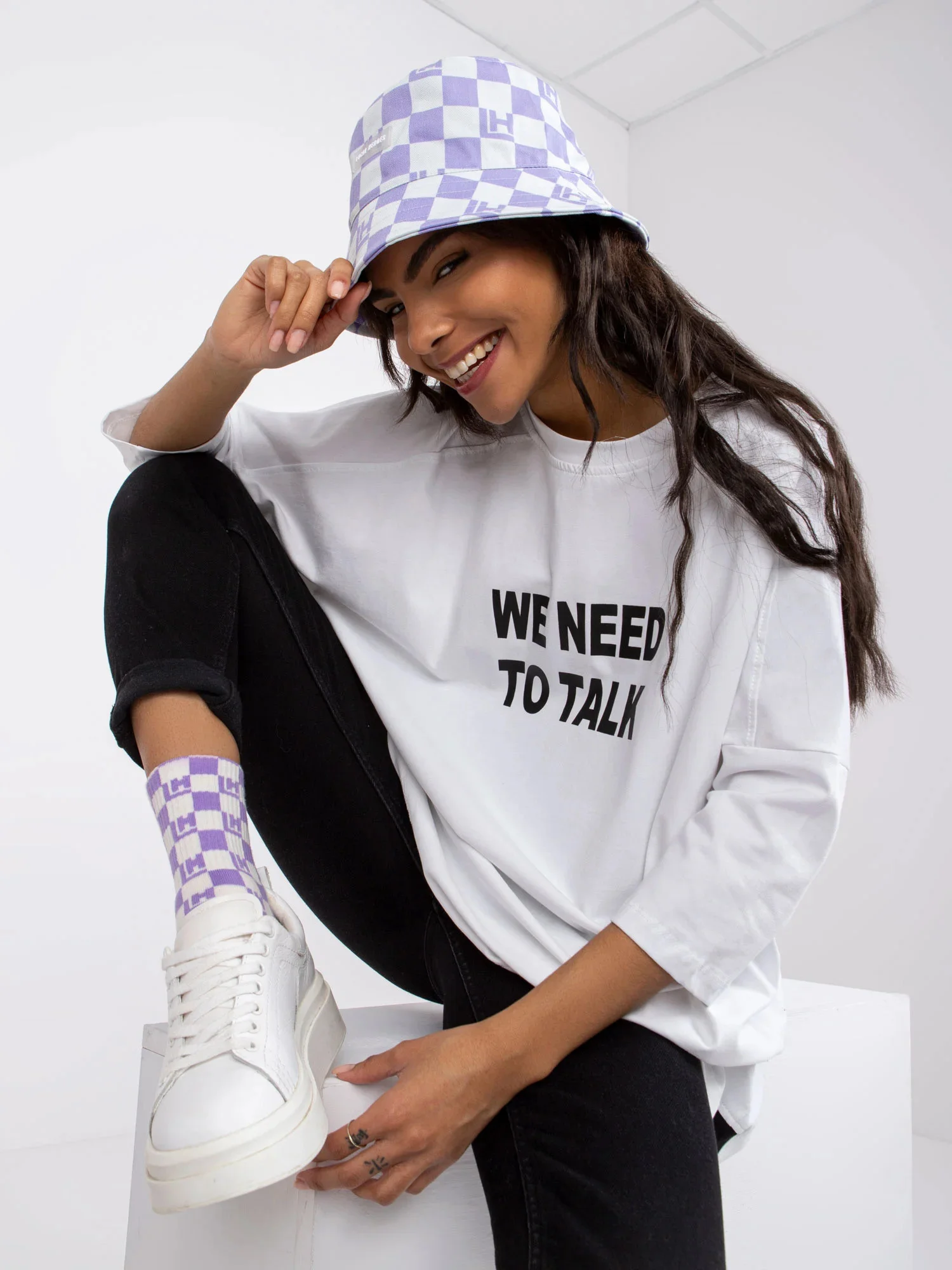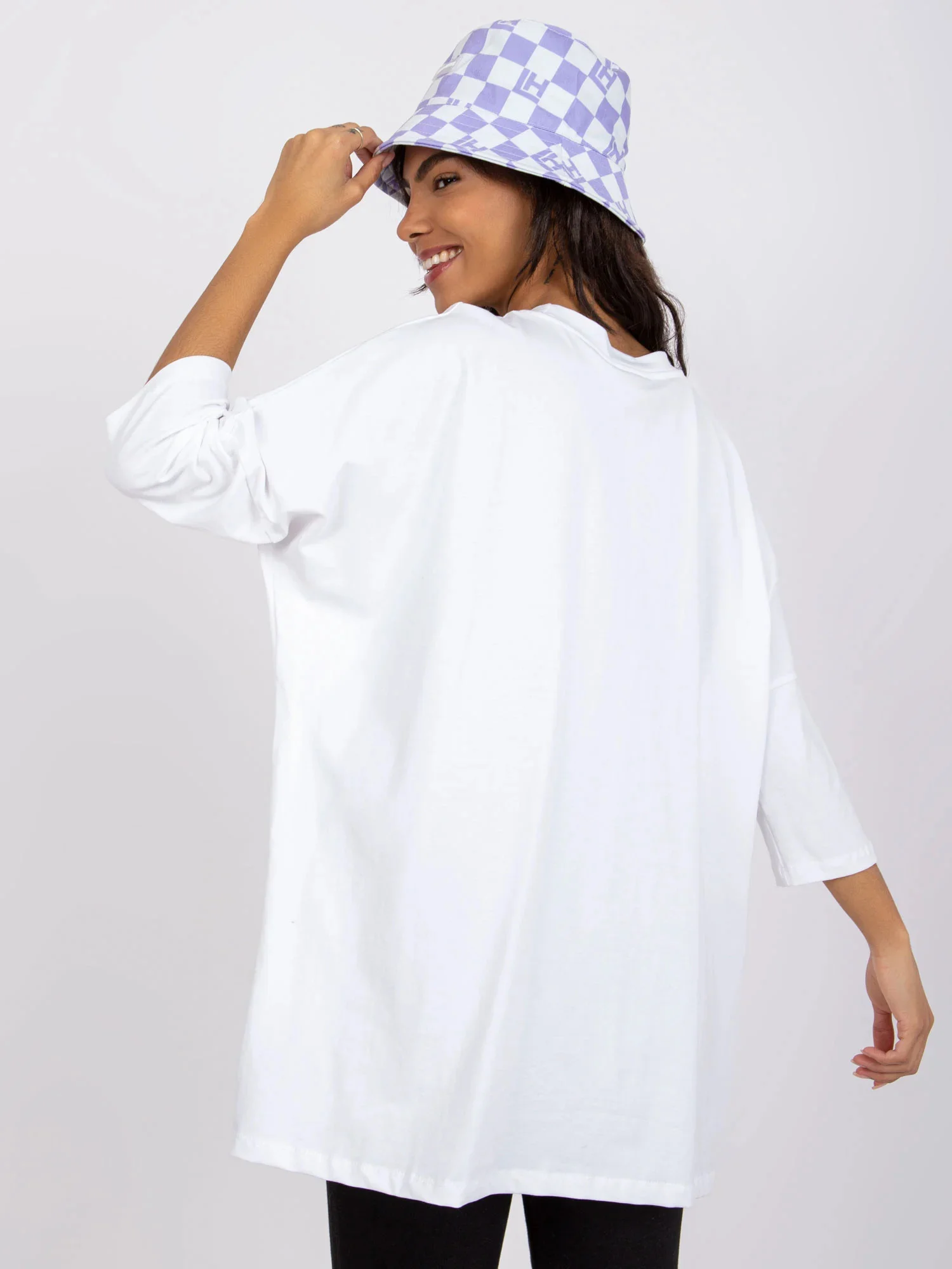 Modelka má na sobě velikost S/M. Rozměry modelky: výška 161 cm, poprsí 81 cm, pas 63 cm, boky 89 cm.