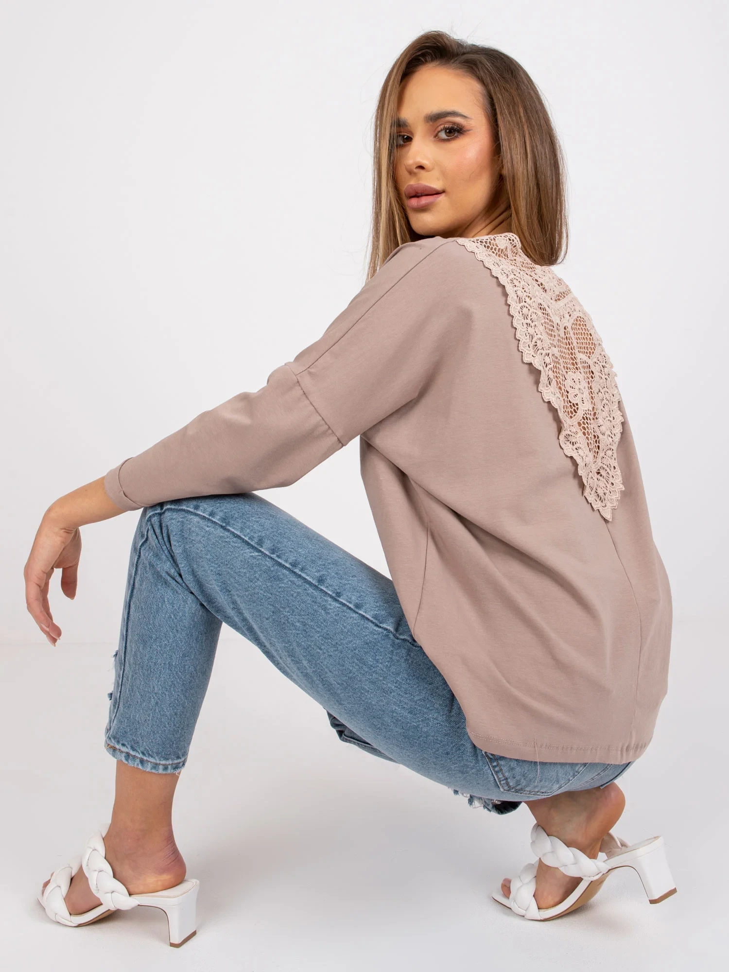 Modelka má na sobě velikost S/M. Rozměry modelky: výška 167 cm, prsa 82 cm, pas 59 cm, boky 83 cm.