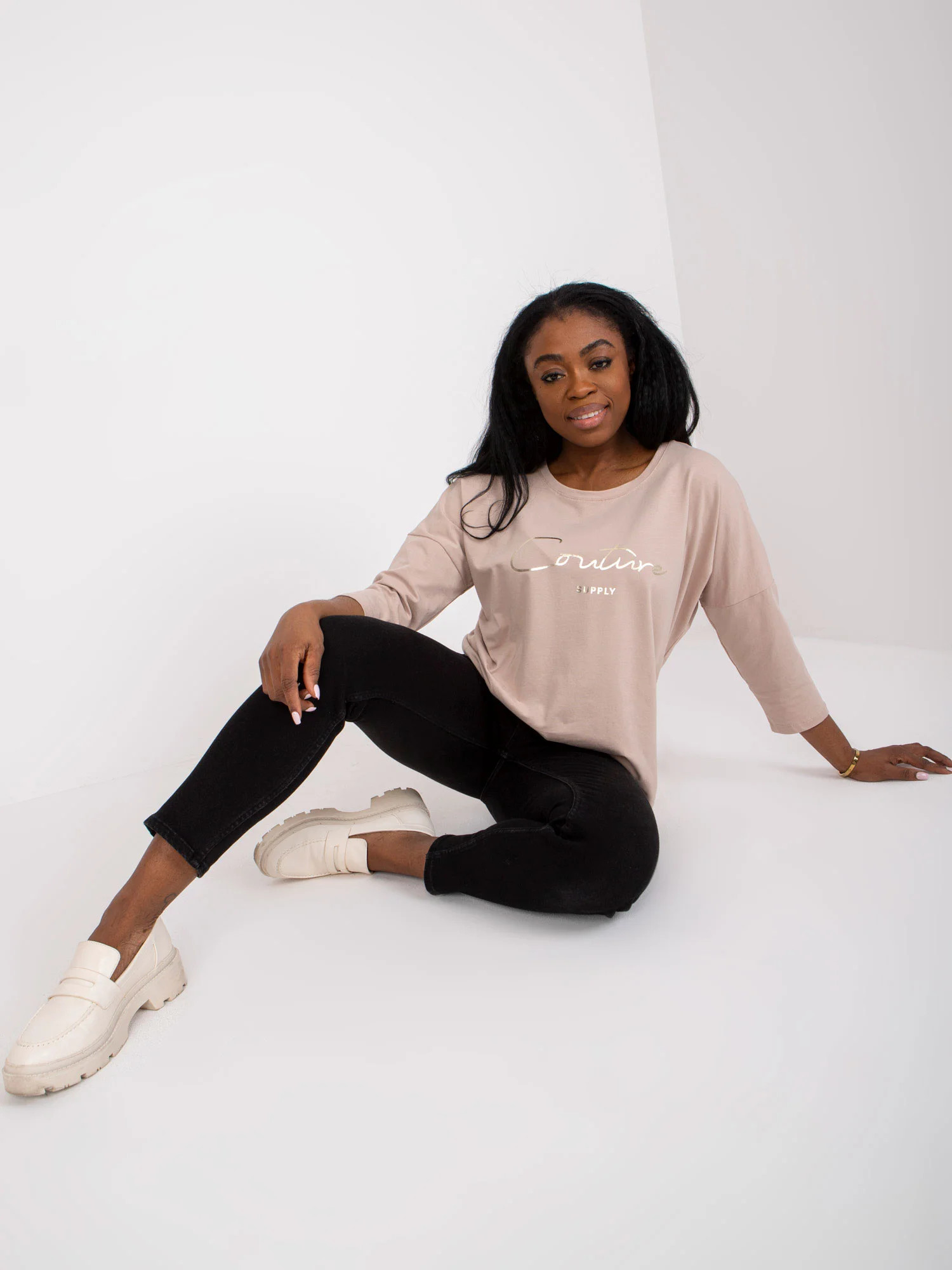Modelka má na sobě velikost S/M. Rozměry modelky: výška 169 cm, poprsí 86 cm, pas 67 cm, boky 88 cm.