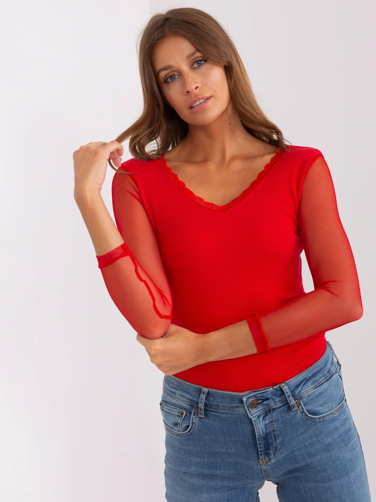 Červená halenka se síťovanými rukávy od RUE PARIS .
