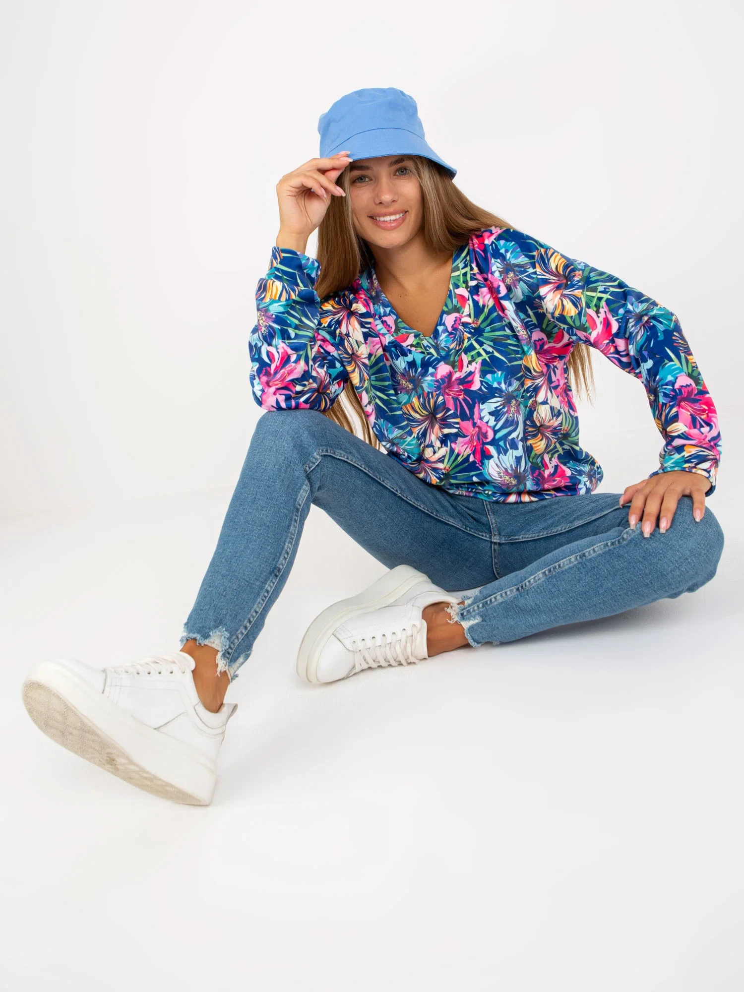 Modrá velurová halenka s potiskem a výstřihem od RUE PARIS .