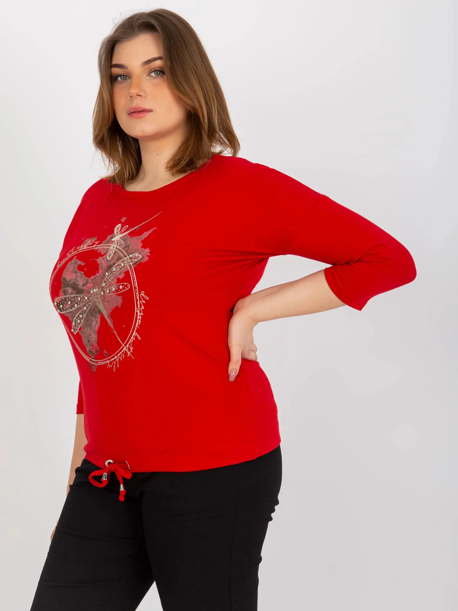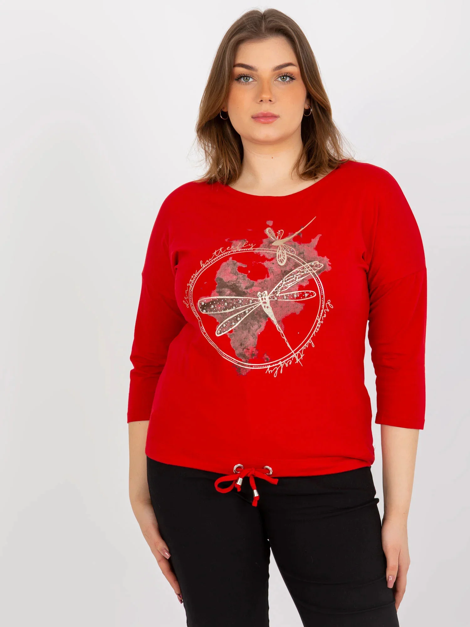 Červená plus size halenka s 3/4 rukávy a potiskem .