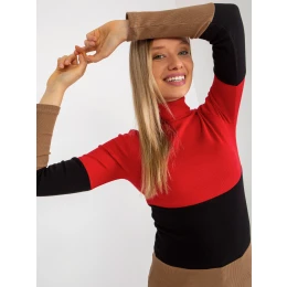 Červeno-temně-kamelová základní halenka s žebrovaným rolákem .