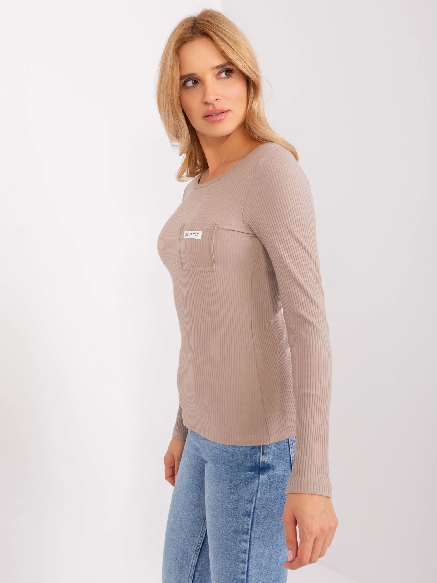 Tmavě béžová halenka s dlouhým rukávem a kapsou .