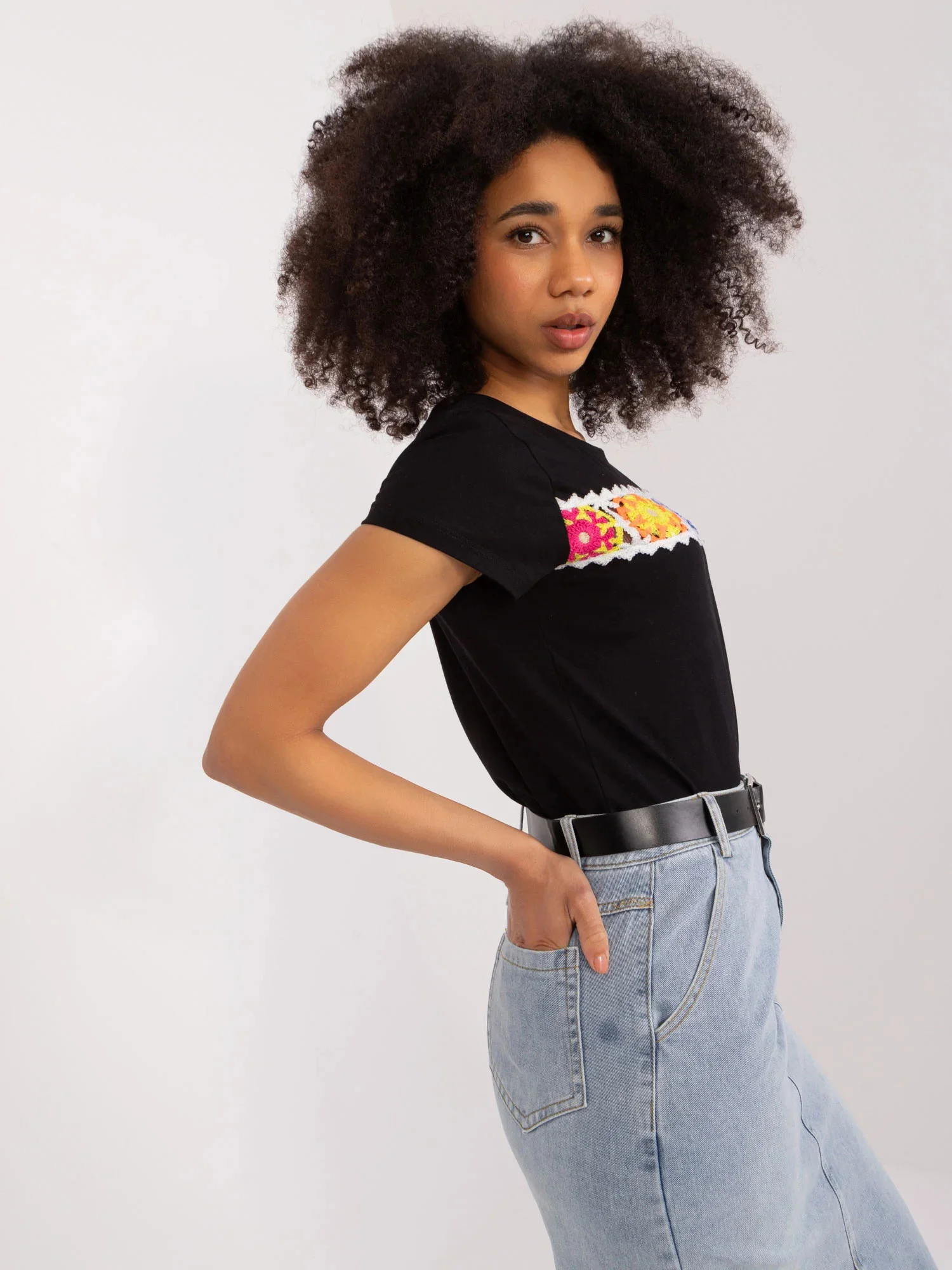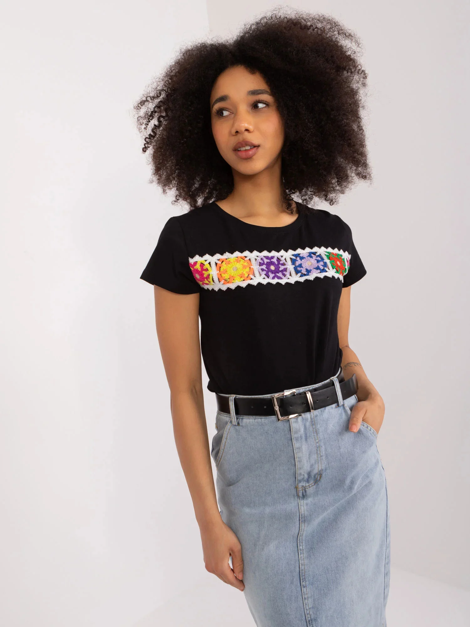 Modelka má na sobě velikost S/M. Rozměry modelky: výška 170 cm, poprsí 86 cm, pas 65 cm, boky 92 cm.