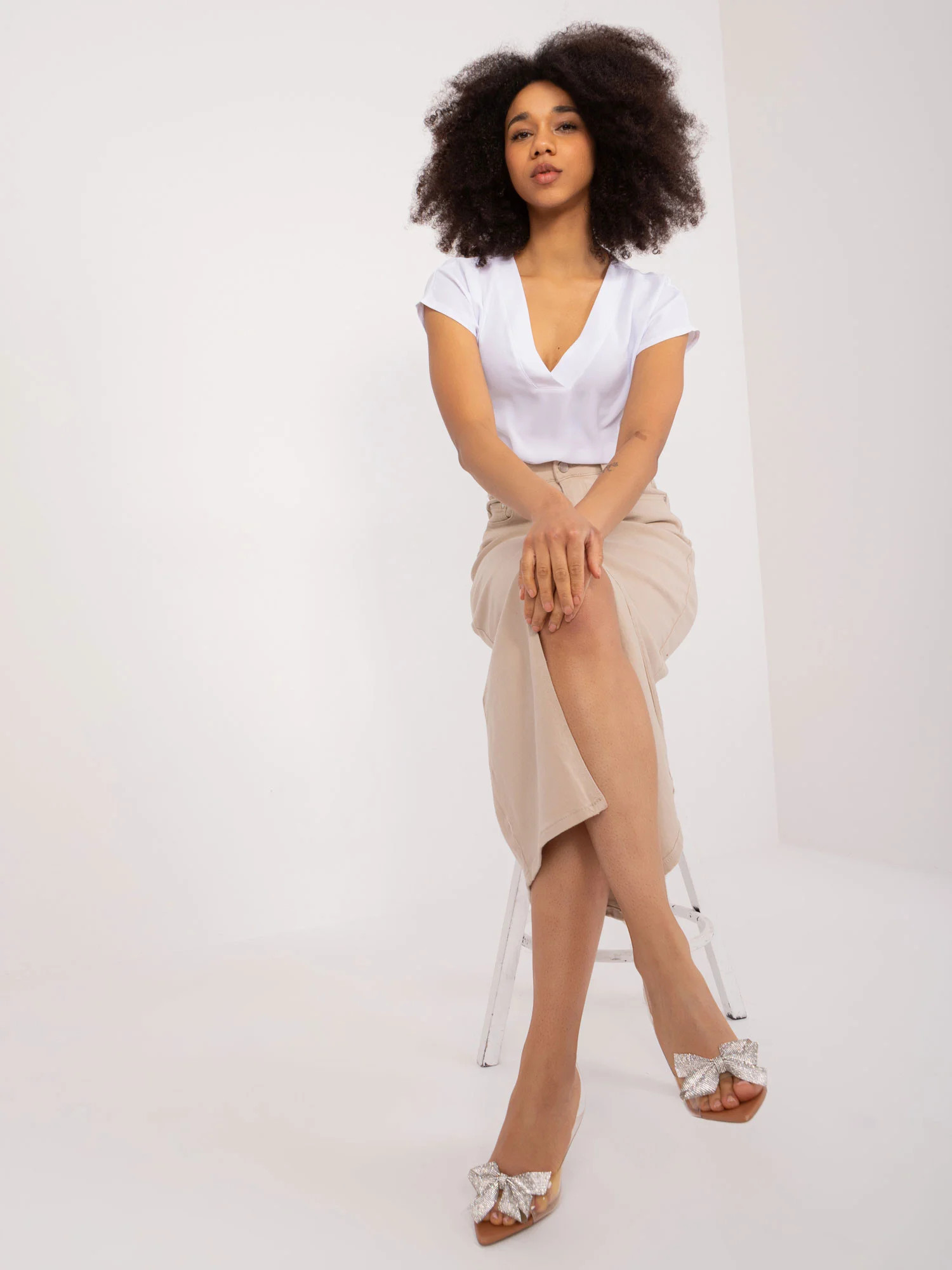 Dámská bílá halenka s prošívaným výstřihem do V. Krátký rukáv.