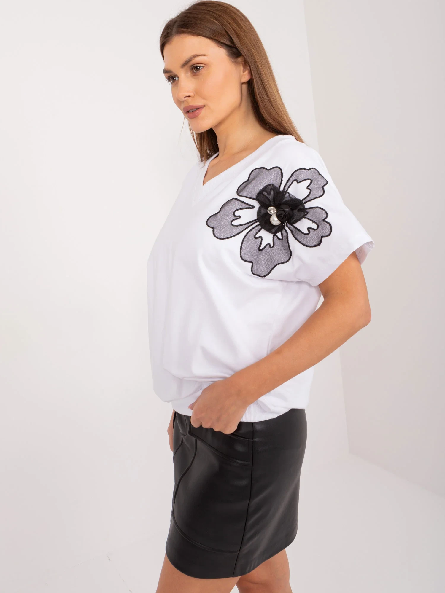 Modelka má na sobě velikost S/M. Rozměry modelky: výška 170 cm, poprsí 93 cm, pas 66 cm, boky 93 cm.
