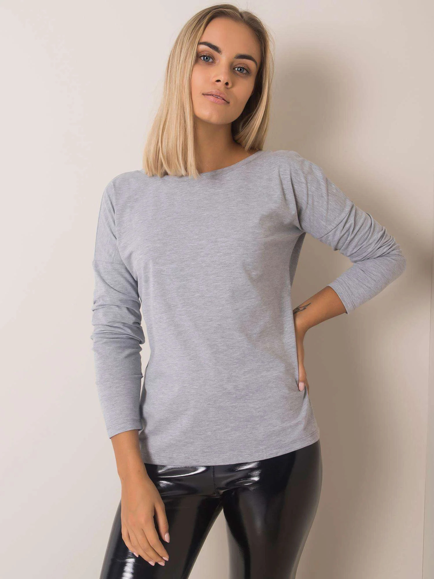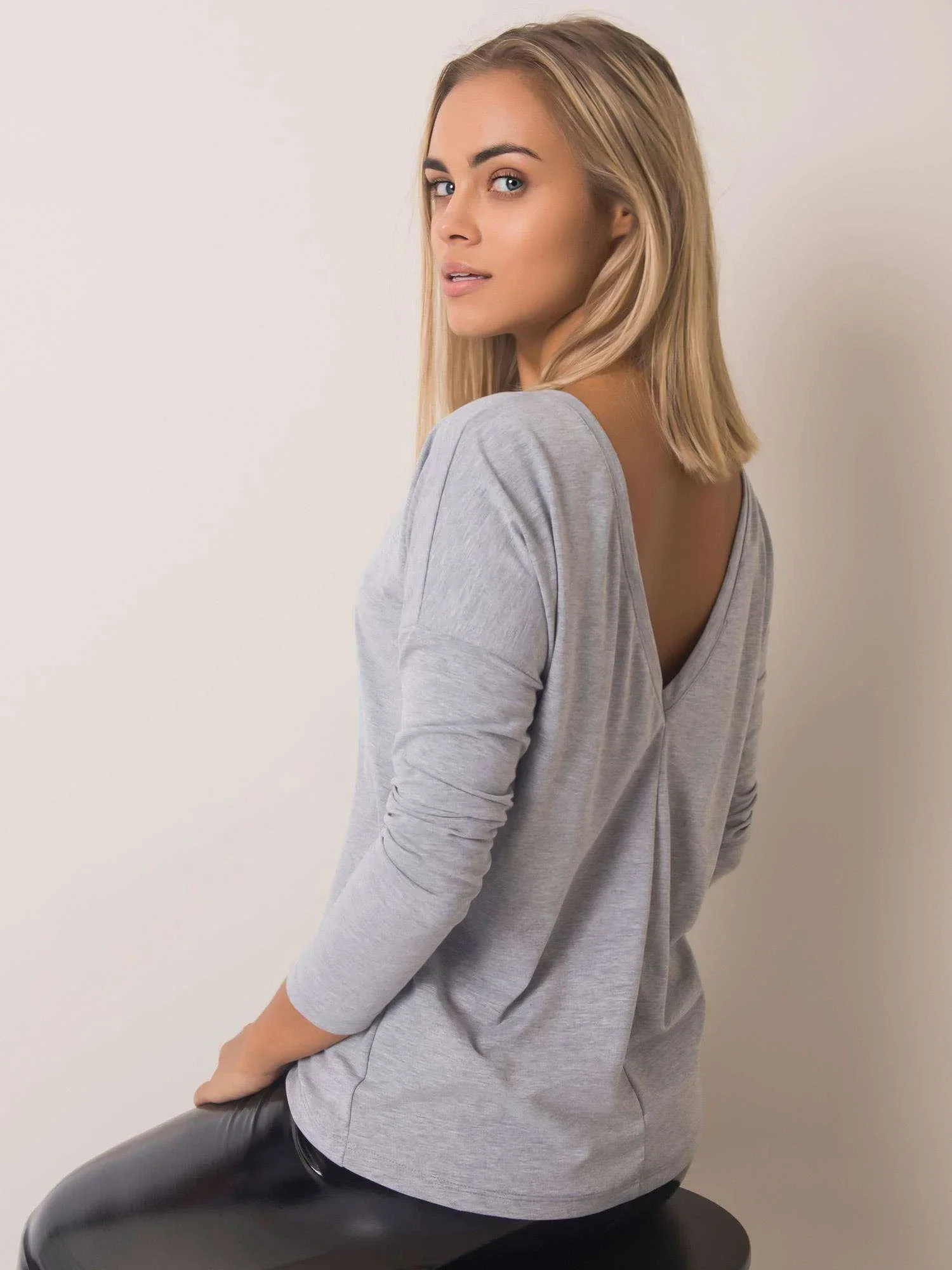 Šedá melanžová halenka s výstřihem na zádech.