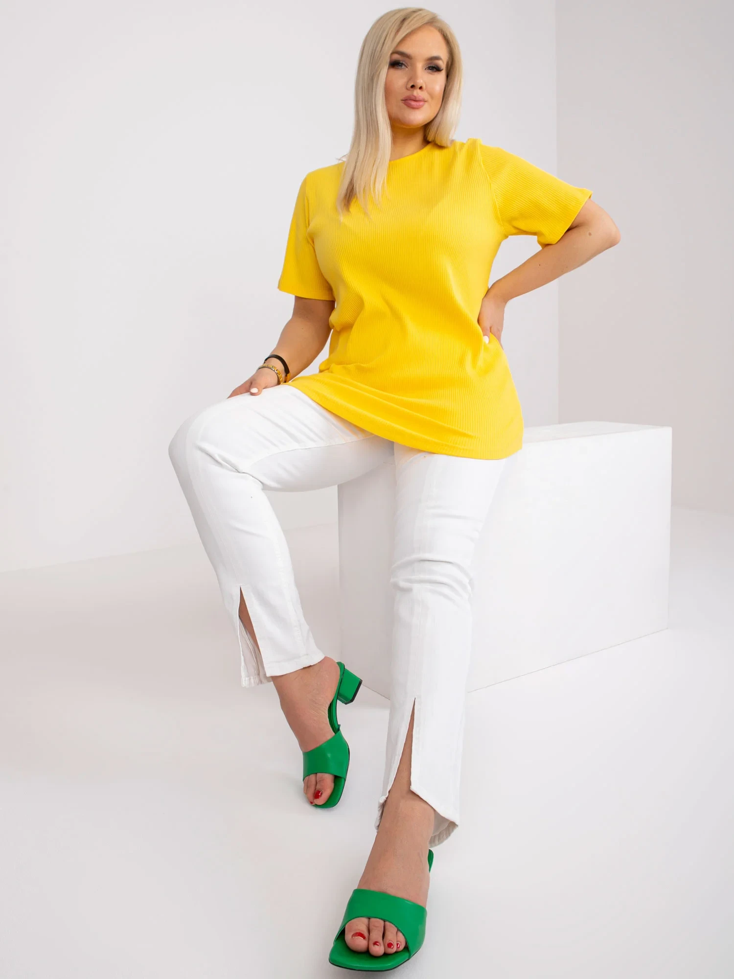 Modelka má na sobě velikost XL. Rozměry modelky: výška 172 cm, prsa 103 cm, pas 73 cm, boky 103 cm.