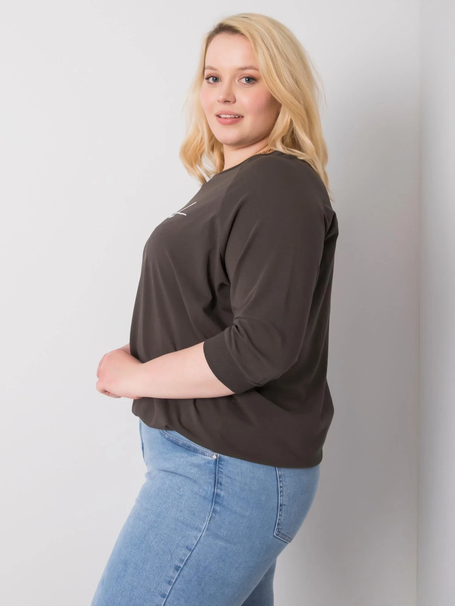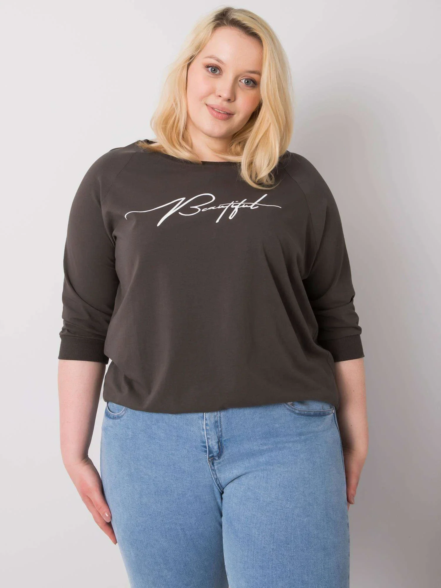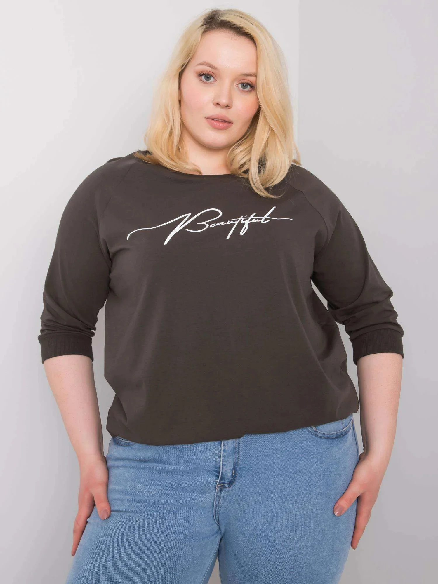 Dámská halenka tmavě khaki barvy s nápisy.