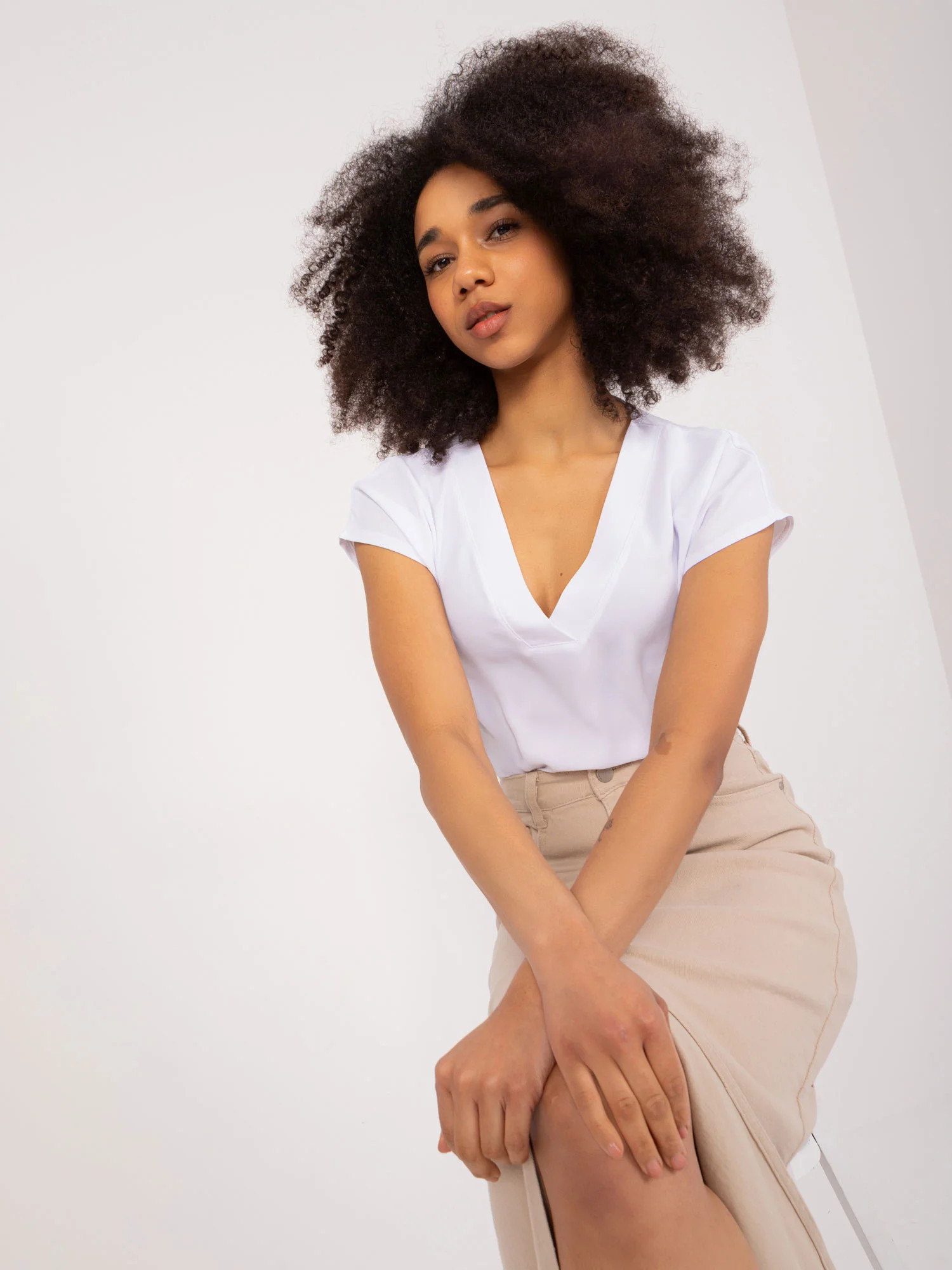 Dámská bílá halenka s prošívaným výstřihem do V. Krátký rukáv.