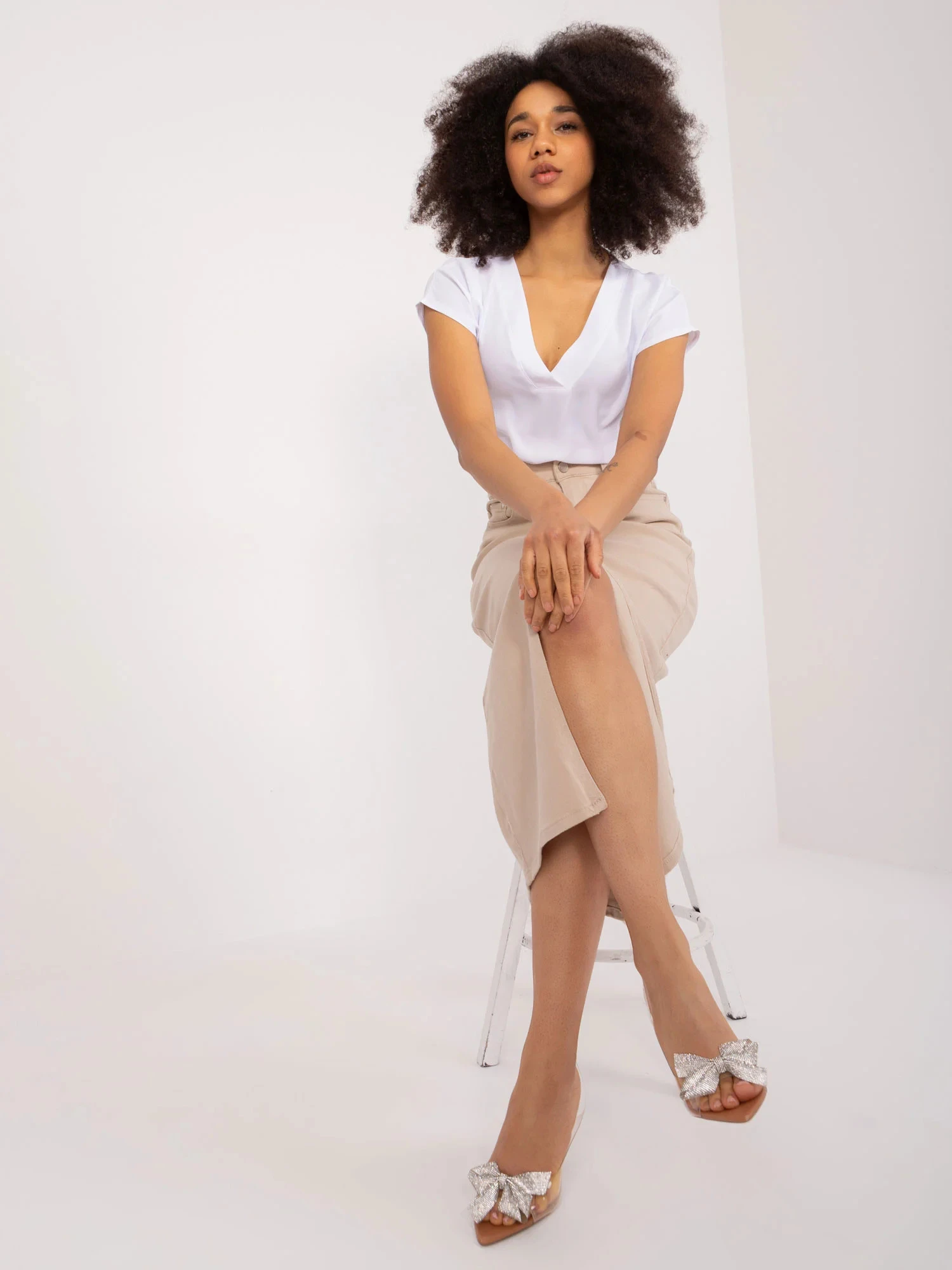 Modelka má na sobě velikost S/M. Rozměry modelky: výška 170 cm, poprsí 86 cm, pas 65 cm, boky 92 cm.