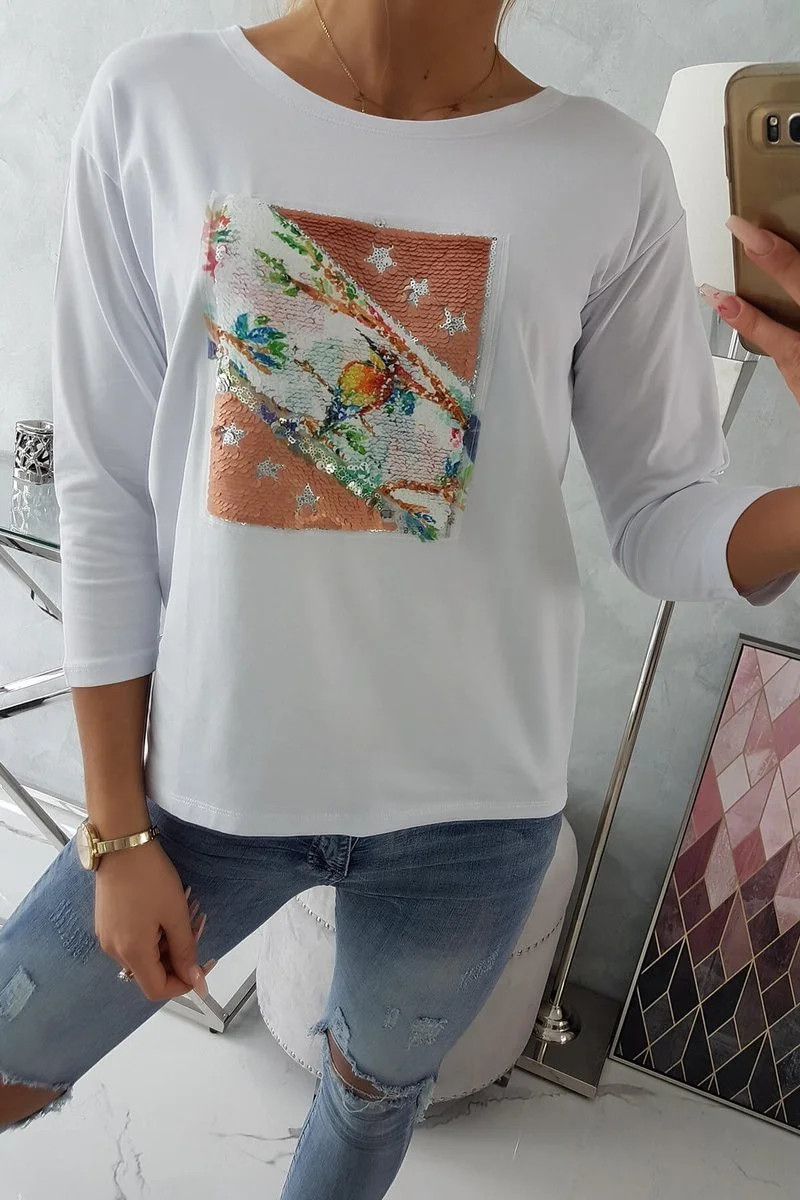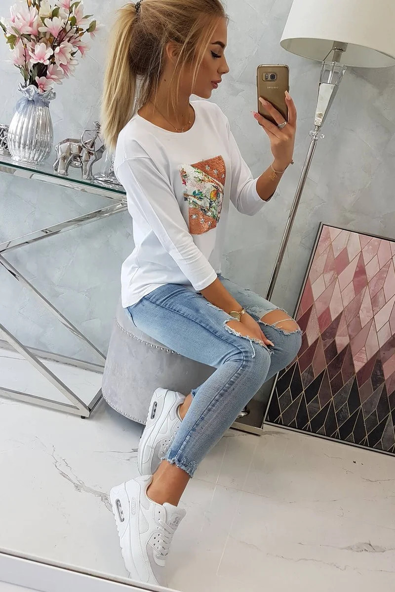 Představujeme vám módní halenku. Halenka má na přední straně flitrovanou grafiku. Ideální pro každodenní použití. Halenka je vyrobena z vysoce kvalitního materiálu. Velikost je univerzální a vyhovuje dámám, které nosí velikost M, L nebo XL.