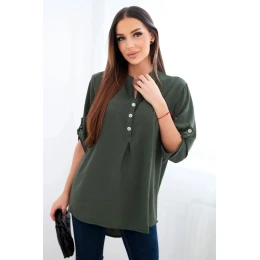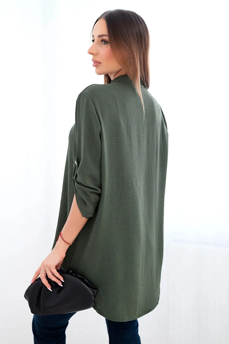 Objevte mimořádnou eleganci a pohodlí v prezentované halence s delšími zády, knoflíkovým výstřihem a ohrnutými rukávy, tato halenka nejen vypadá výjimečně stylově, ale poskytuje také bezkonkurenční funkčnost. Ciťte se sebevědomě a elegantně v halence, která podtrhne váš jedinečný styl. Díky delším zadním dílům vytvoříte jemné a módně nepravidelné proporce a knoflíkový výstřih vám umožní upravit si halenku podle vašich preferencí. Vyhrnuté rukávy dodávají halence lehkost a ležérní charakter, ideální pro různé příležitosti. Ať už se jedná o obchodní jednání nebo relaxační kávu s přáteli, naše halenka vám poskytne pohodlí a styl v jednom. Nenechte si ujít příležitost přidat do svého šatníku tuto jedinečnou halenku! Objevte eleganci, pohodlí a funkčnost v jednom a zdůrazněte svůj jedinečný styl ještě dnes. Velikost je univerzální a bude vhodná pro ženy, které nosí velikost S, M nebo L.