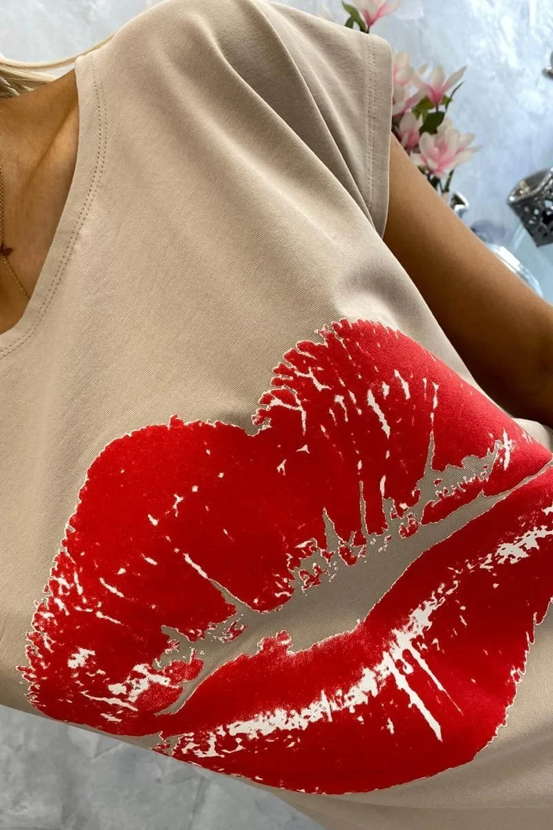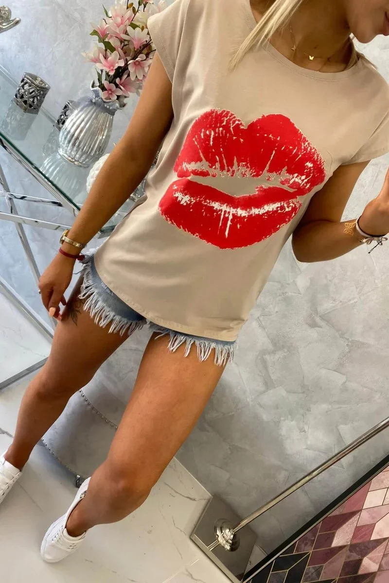 Představujeme vám módní halenku. Halenka s potiskem rtů. Halenka s krátkým rukávem. Super grafika na tričku. Halenka ideální na léto s šortkami. Halenka je vyrobena z vysoce kvalitního materiálu. Velikost je univerzální a vyhovuje dámám, které nosí velikost S, M nebo L.