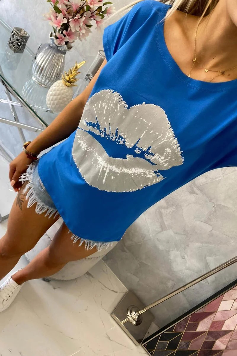 Představujeme vám módní halenku. Halenka s potiskem rtů. Halenka s krátkým rukávem. Super grafika na tričku. Halenka ideální na léto s šortkami. Halenka je vyrobena z vysoce kvalitního materiálu. Velikost je univerzální a vyhovuje dámám, které nosí velikost S, M nebo L.