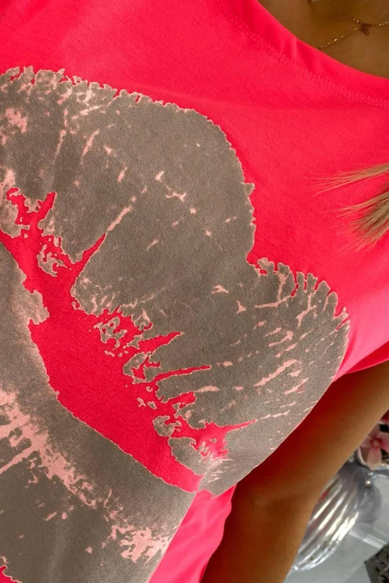 Halenka s potiskem rtů růžová neonová