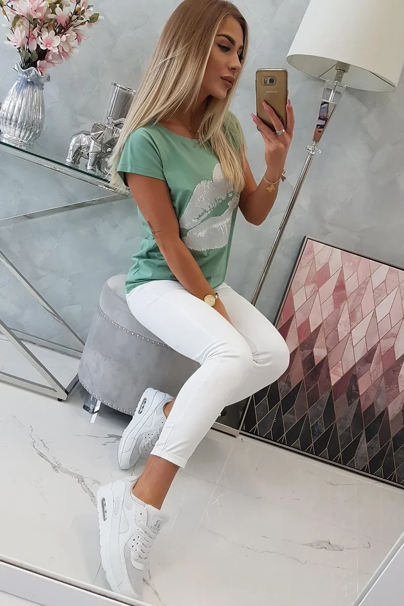 Představujeme vám módní halenku. Halenka s potiskem rtů. Halenka s krátkým rukávem. Super grafika na tričku. Halenka ideální na léto s šortkami. Halenka je vyrobena z vysoce kvalitního materiálu. Velikost je univerzální a vyhovuje dámám, které nosí velikost S, M nebo L.
