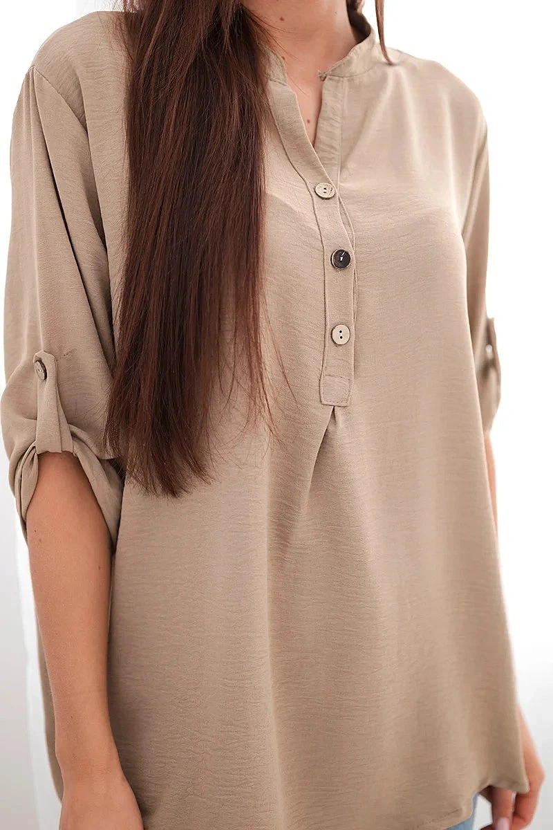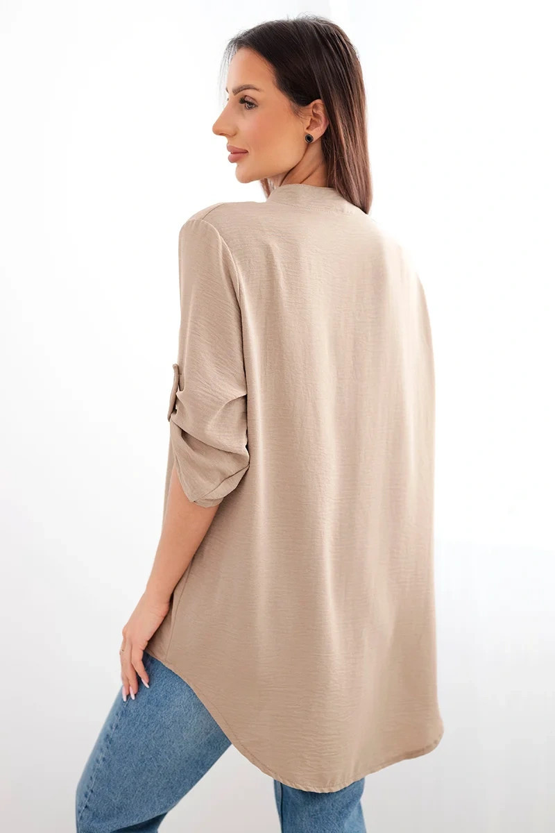 Objevte mimořádnou eleganci a pohodlí v prezentované halence s delšími zády, knoflíkovým výstřihem a ohrnutými rukávy, tato halenka nejen vypadá výjimečně stylově, ale poskytuje také bezkonkurenční funkčnost. Ciťte se sebevědomě a elegantně v halence, která podtrhne váš jedinečný styl. Díky delším zadním dílům vytvoříte jemné a módně nepravidelné proporce a knoflíkový výstřih vám umožní upravit si halenku podle vašich preferencí. Vyhrnuté rukávy dodávají halence lehkost a ležérní charakter, ideální pro různé příležitosti. Ať už se jedná o obchodní jednání nebo relaxační kávu s přáteli, naše halenka vám poskytne pohodlí a styl v jednom. Nenechte si ujít příležitost přidat do svého šatníku tuto jedinečnou halenku! Objevte eleganci, pohodlí a funkčnost v jednom a zdůrazněte svůj jedinečný styl ještě dnes. Velikost je univerzální a bude vhodná pro ženy, které nosí velikost S, M nebo L.