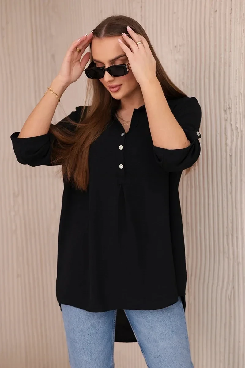 Objevte mimořádnou eleganci a pohodlí v prezentované halence s delšími zády, knoflíkovým výstřihem a ohrnutými rukávy, tato halenka nejen vypadá výjimečně stylově, ale poskytuje také bezkonkurenční funkčnost. Ciťte se sebevědomě a elegantně v halence, která podtrhne váš jedinečný styl. Díky delším zadním dílům vytvoříte jemné a módně nepravidelné proporce a knoflíkový výstřih vám umožní upravit si halenku podle vašich preferencí. Vyhrnuté rukávy dodávají halence lehkost a ležérní charakter, ideální pro různé příležitosti. Ať už se jedná o obchodní jednání nebo relaxační kávu s přáteli, naše halenka vám poskytne pohodlí a styl v jednom. Nenechte si ujít příležitost přidat do svého šatníku tuto jedinečnou halenku! Objevte eleganci, pohodlí a funkčnost v jednom a zdůrazněte svůj jedinečný styl ještě dnes. Velikost je univerzální a bude vhodná pro ženy, které nosí velikost S, M nebo L.