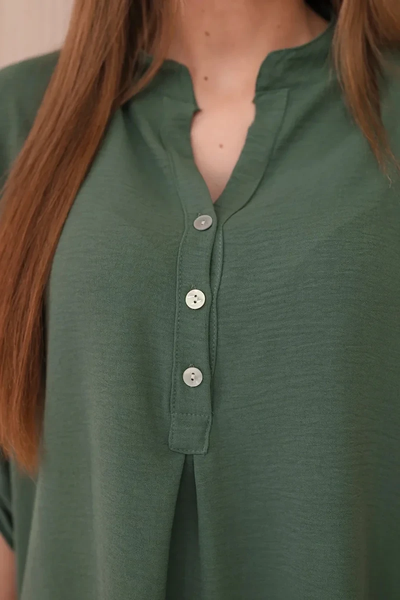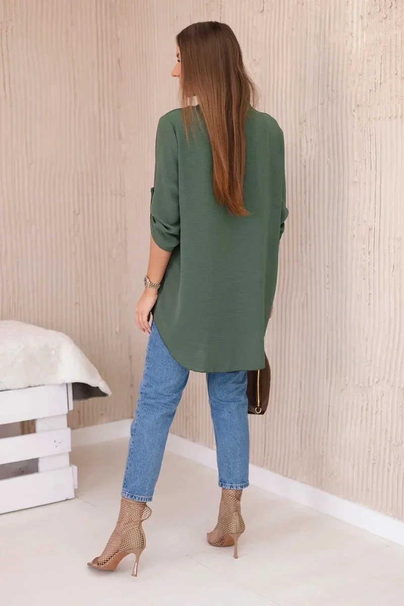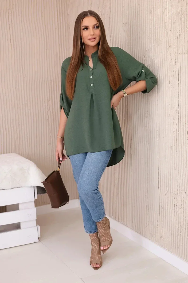 Objevte mimořádnou eleganci a pohodlí v prezentované halence s delšími zády, knoflíkovým výstřihem a ohrnutými rukávy, tato halenka nejen vypadá výjimečně stylově, ale poskytuje také bezkonkurenční funkčnost. Ciťte se sebevědomě a elegantně v halence, která podtrhne váš jedinečný styl. Díky delším zadním dílům vytvoříte jemné a módně nepravidelné proporce a knoflíkový výstřih vám umožní upravit si halenku podle vašich preferencí. Vyhrnuté rukávy dodávají halence lehkost a ležérní charakter, ideální pro různé příležitosti. Ať už se jedná o obchodní jednání nebo relaxační kávu s přáteli, naše halenka vám poskytne pohodlí a styl v jednom. Nenechte si ujít příležitost přidat do svého šatníku tuto jedinečnou halenku! Objevte eleganci, pohodlí a funkčnost v jednom a zdůrazněte svůj jedinečný styl ještě dnes. Velikost je univerzální a bude vhodná pro ženy, které nosí velikost S, M nebo L.