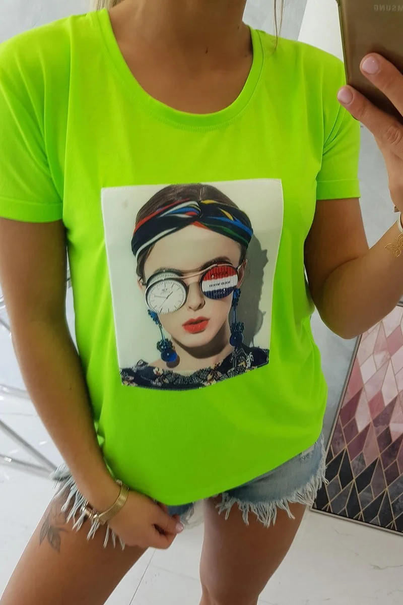 Halenka s grafikou ženy.