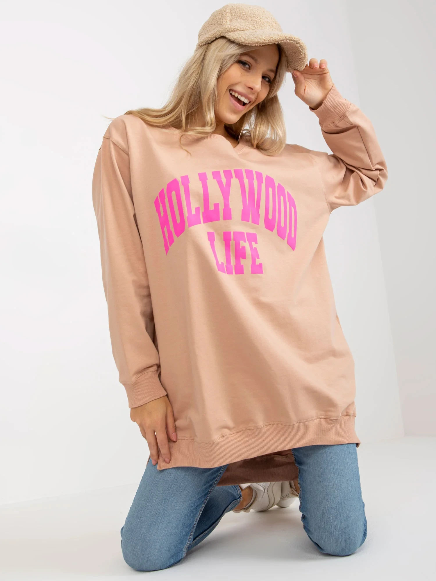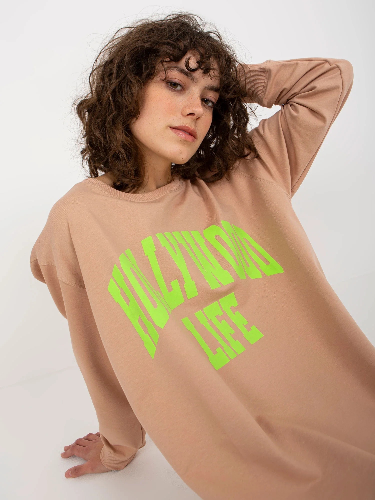 Beżowo-zielona długa bluza oversize z napisem .