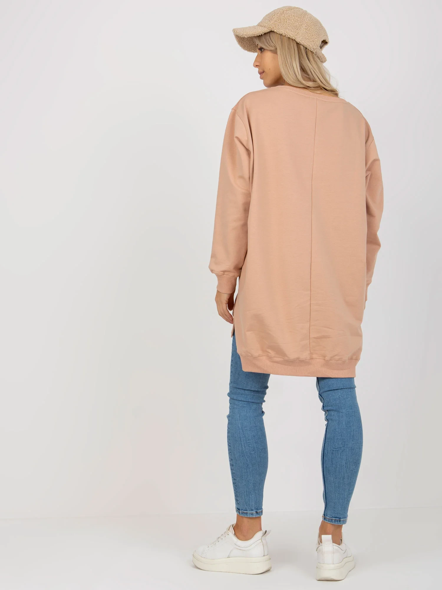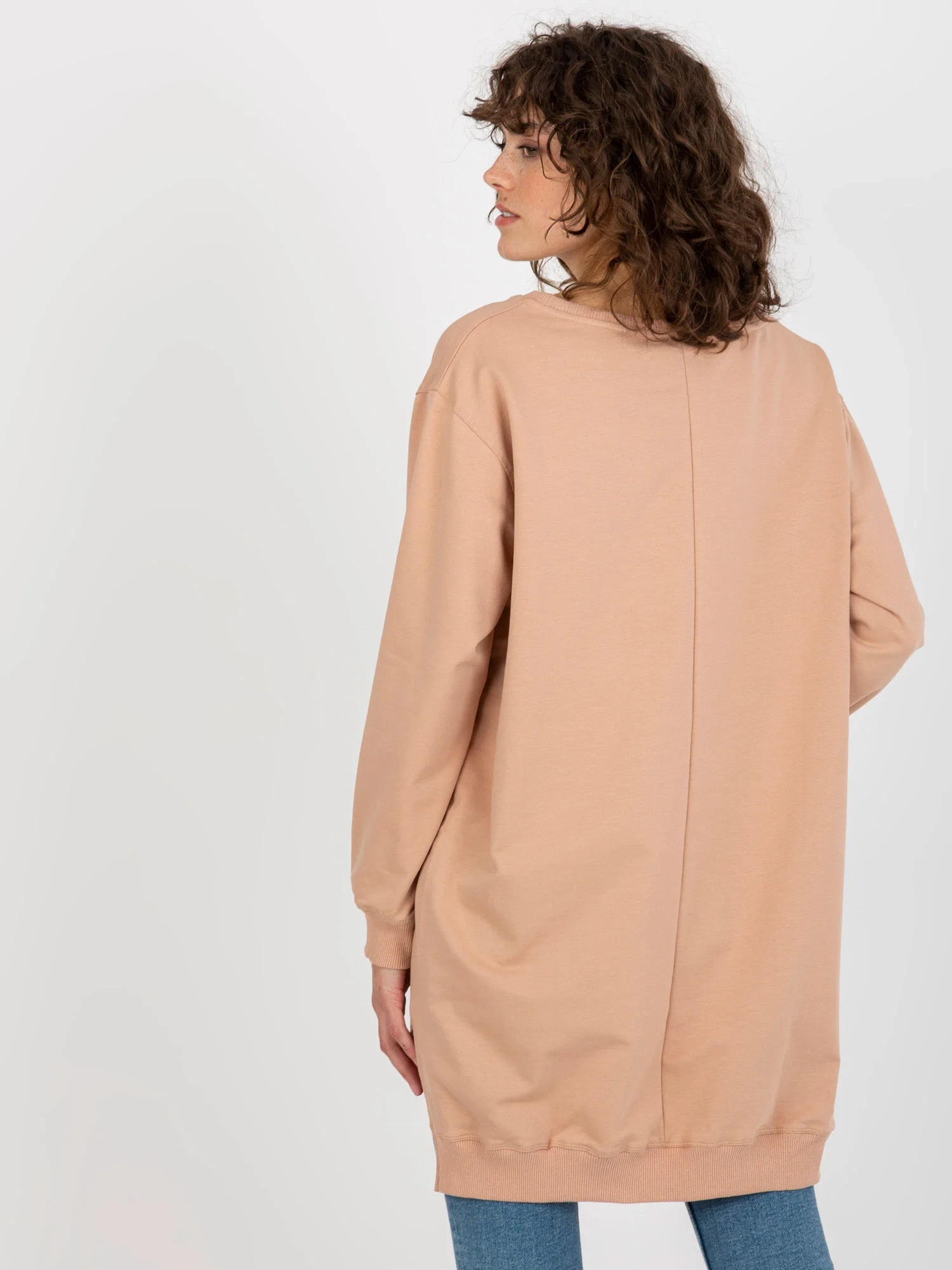 Wymiary bluzy w rozmiarze one size mierzone na płasko: szerokość pod pachami - 65 cm, długość rękawa - 58 cm, długość całkowita (przód) - 75 cm, długość całkowita (tył) - 86 cm.