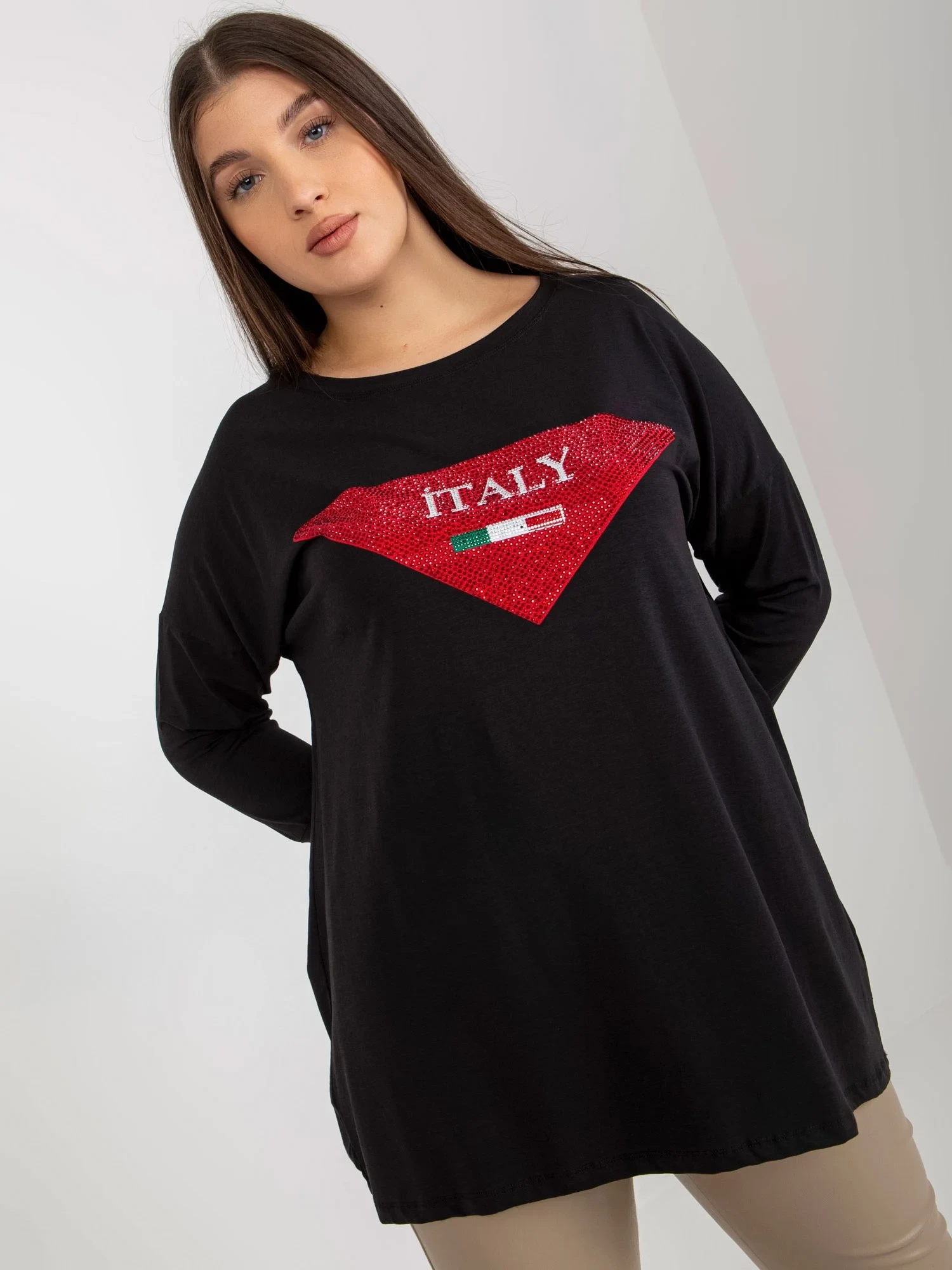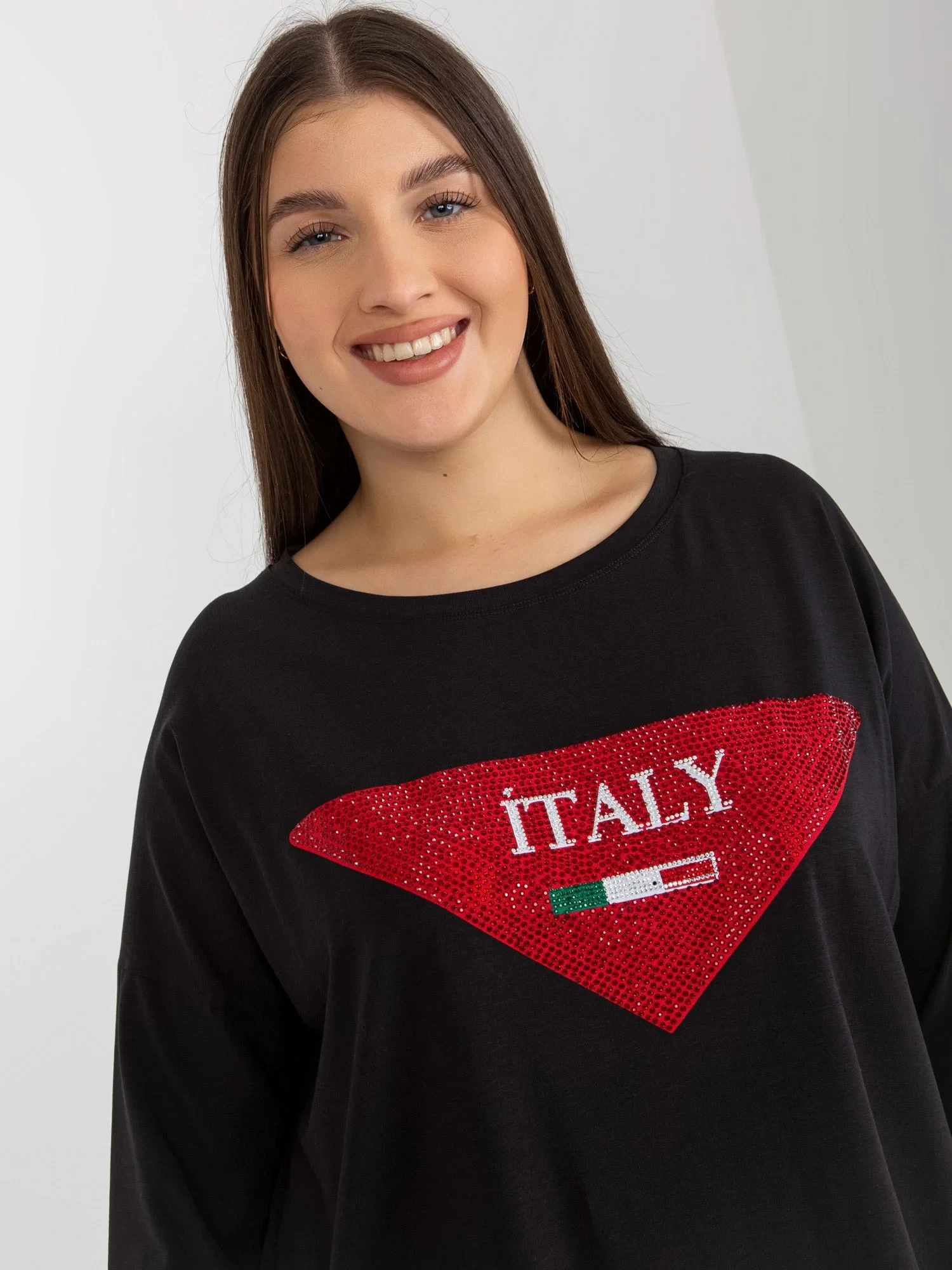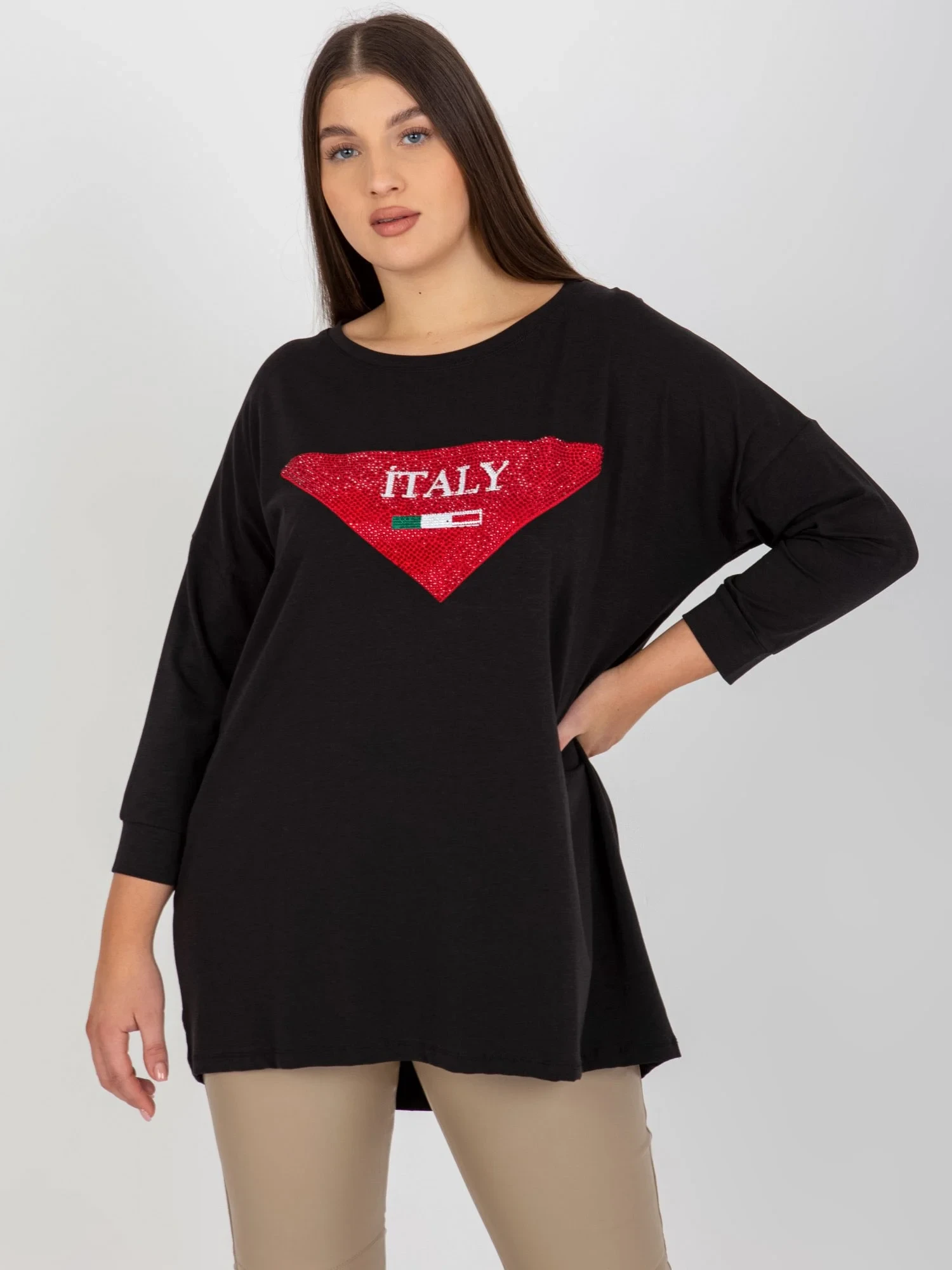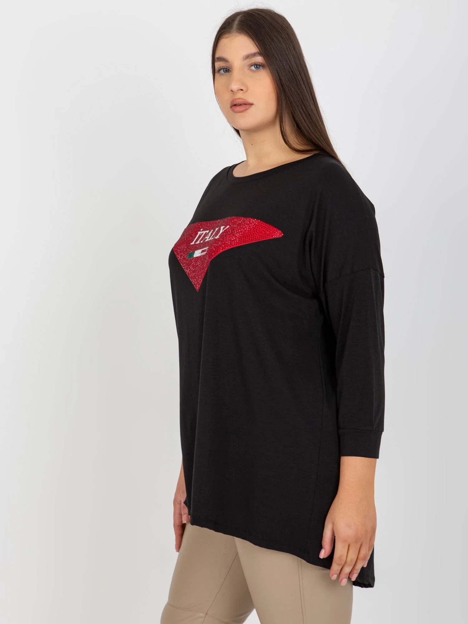 Modelka má na sobě jednu velikost. Rozměry modelky: výška 174 cm, prsa 100 cm, pas 74 cm, boky 107 cm.