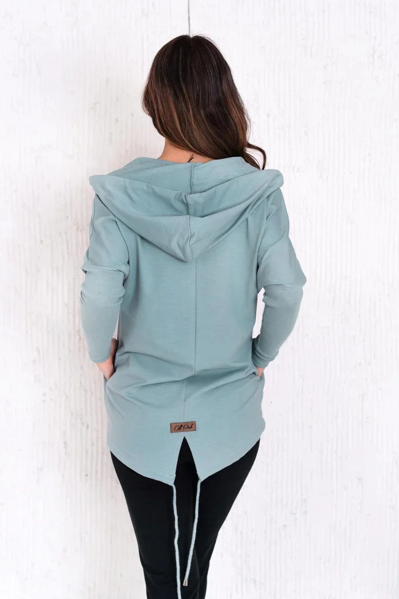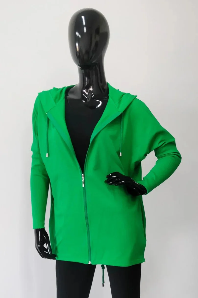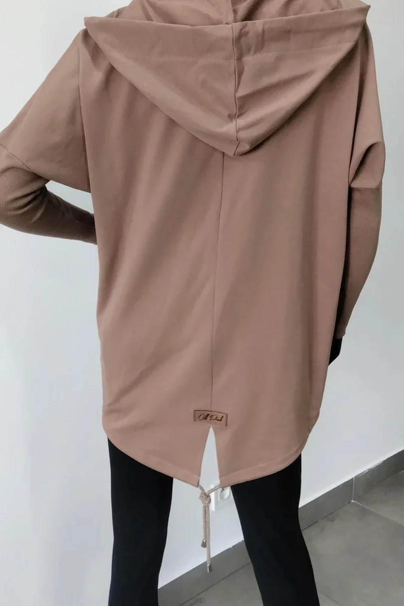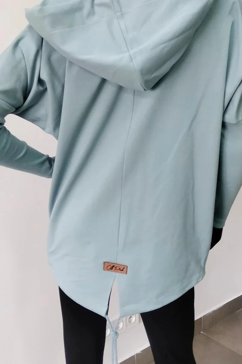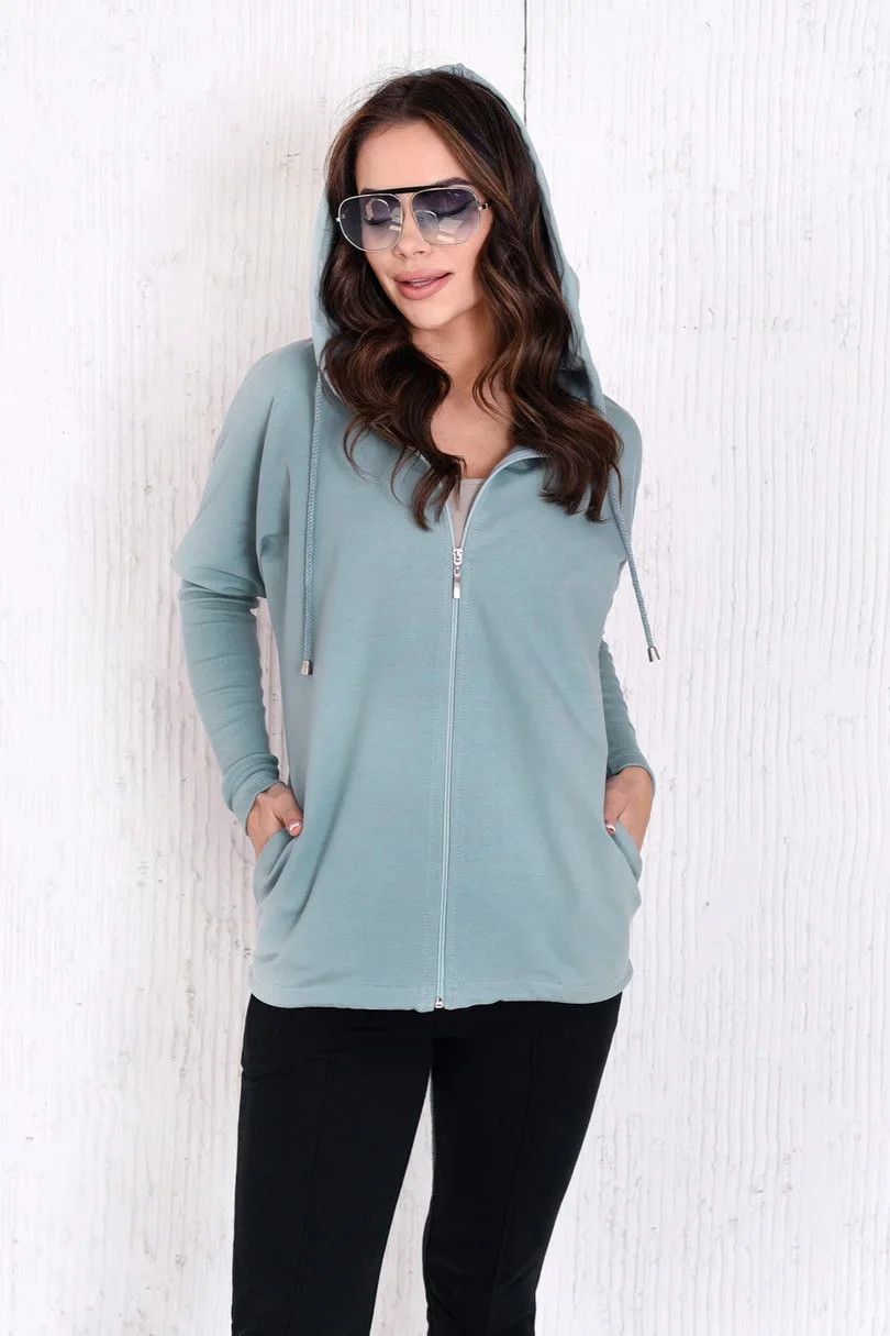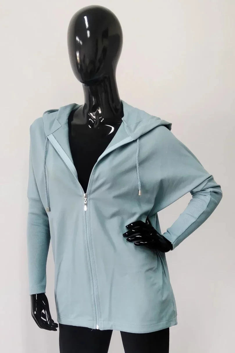 Dámská mikina na zip s kapucí. Rukávy jsou žebrované, zadní část mikiny je prodloužená s přestávkou a šňůrkou na stažení. Složení: 95% bavlna, 5% elastan