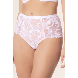Figi wykonane są z delikatnej, kwiatowej koronki podszytej beżową siateczką, co nadaje im subtelnej lekkości i estetycznego wyglądu, jednocześnie zachowując pełne krycie. Szerokie, zabudowane boki zapewniają stabilność i komfort, a płaska, elastyczna gumka z przodu nie uciska i pozostaje niewidoczna pod ubraniem.