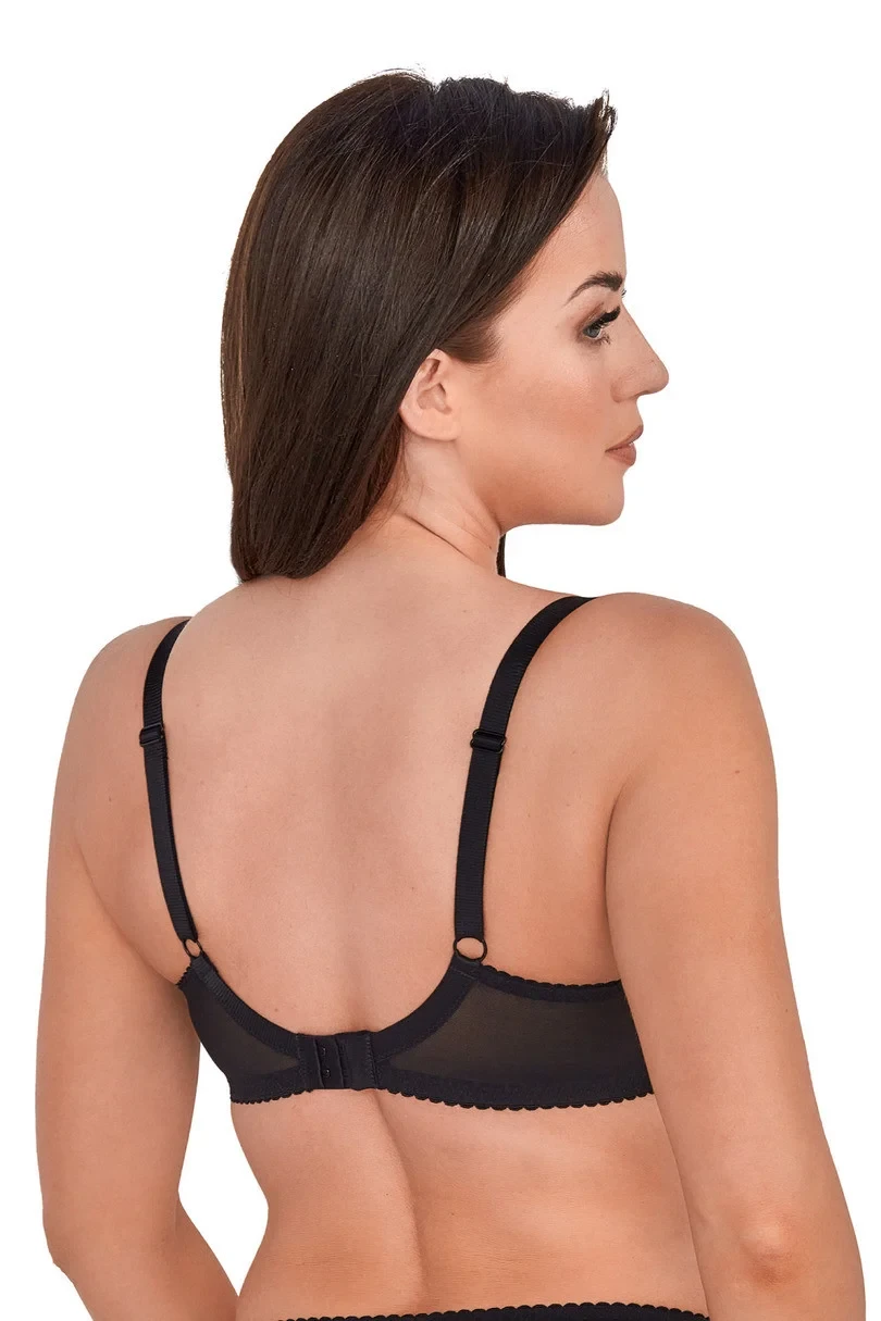 Poloměkká podprsenka, spodní část košíčků z béžové pěny, celá pokrytá černou krajkou, obvod ze síťoviny, vyztužená boční kosticí.