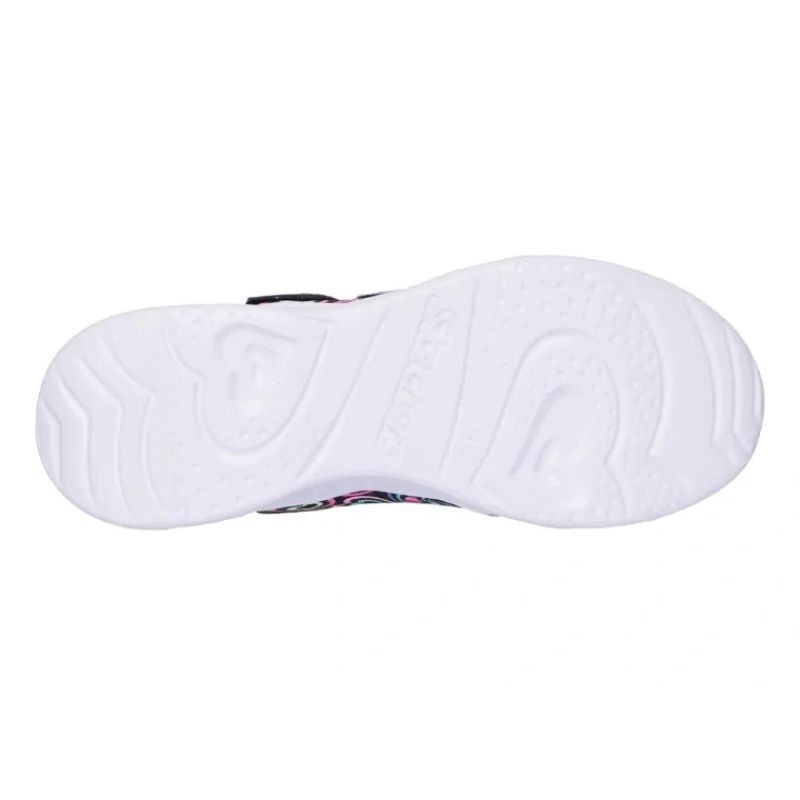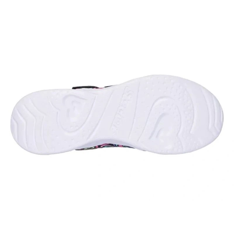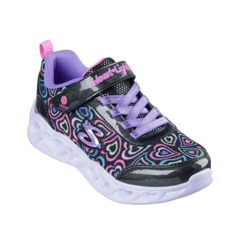 Skechers S-Lights Heart Lights - Boogie Love jsou dynamické dívčí tenisky, které kombinují barevný design s funkčností a zábavou. Textilní a syntetický svršek v trendy barevném provedení Black/Multi upoutá pozornost svými srdíčkovými detaily a ozdobnými akcenty. Svítící srdíčková podrážka se aktivuje při každém kroku a dodává nošení ještě více zábavy.