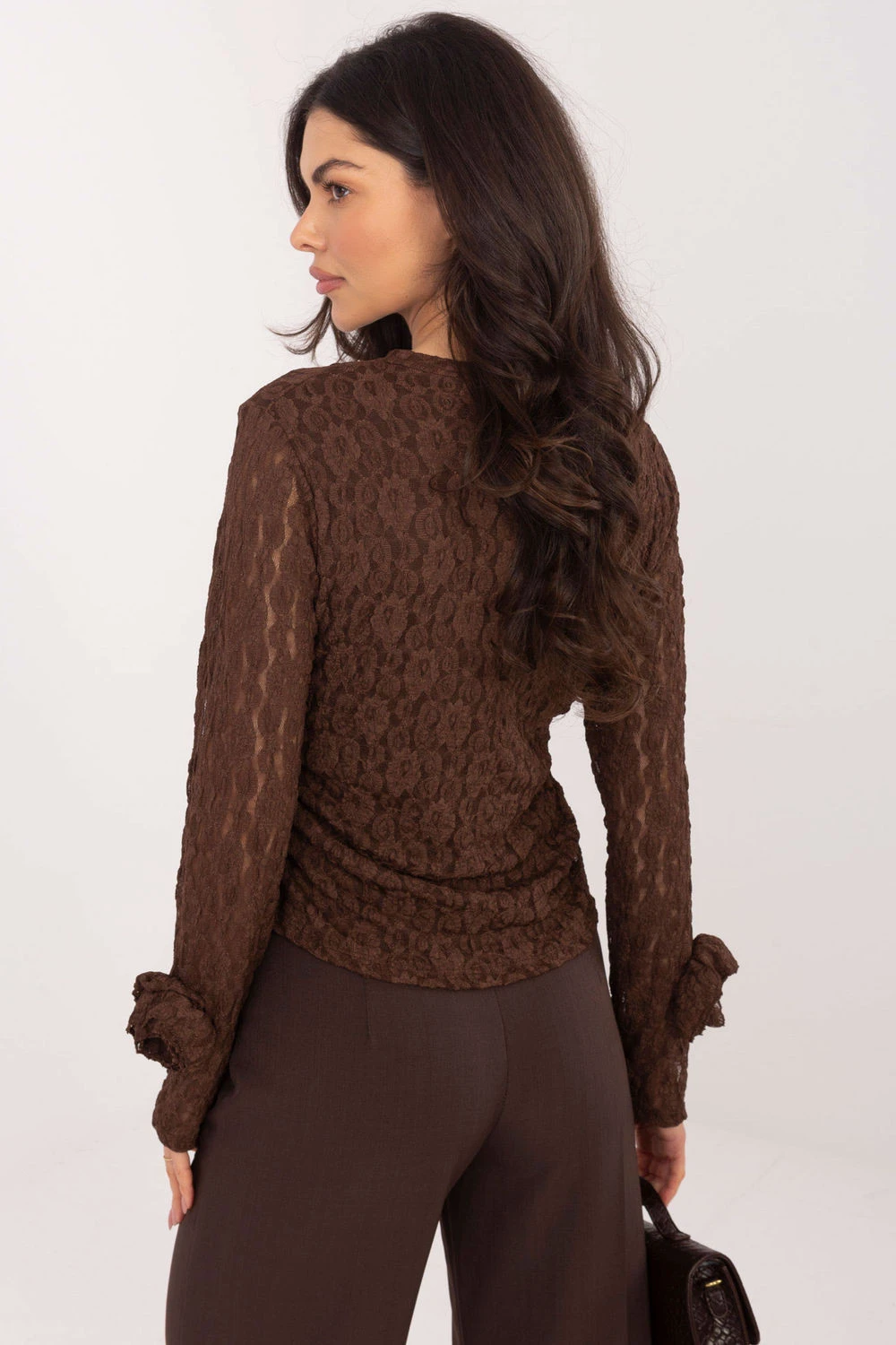 Elegantní, přizpůsobená krajková blůzka je výjimečný model, který spojuje ženskost, jemný šarm a výrazné detaily. Vyrobená z vysoce kvalitní viskózy s přídavkem elastanu, okouzluje pohodlím, měkkostí a krásnou, pestrou strukturou krajky. Model má kulatý výstřih a dlouhé rukávy bez podšívky, díky čemuž je jemný vzor krajky na rukávech plně viditelný. Rukávy zdobí efektní růže vyrobené ze stejné krajky, vytvářející elegantní a velmi ženský akcent. Tělo blůzky je vybaveno podšívkou, což zajistí pohodlí, estetické uspořádání a plnou volnost nošení. Další rýhy po stranách jemně modelují siluetu, zdůrazňují pas a dodávají blůzce rafinovaný charakter. Model nemá zapínání, pohodlně se obléká přes hlavu. Tato blůzka je ideální volbou na návštěvy, večírky, do práce a všude tam, kde chcete spojit eleganci s výjimečným, propracovaným detailem.