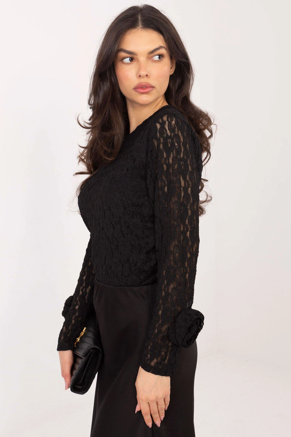 Elegantní, přiléhavá krajková blůza je zvláštní model, který spojuje ženskost, jemný šarm a výrazné detaily. Vyrobená z vysoce kvalitní viskózy s přídavkem elastanu, ohromuje pohodlím, měkkostí a krásnou, pestrou texturou korálky. Model má kulatý výstřih a dlouhé rukávy bez podšívky, díky čemuž je jemný vzor korálky plně viditelný. Rukávy zdobí efektní růže vyrobené ze stejné korálky, vytvářející elegantní a velmi ženský akcent. Tělo blůzy je vybaveno podšívkou, což zajišťuje pohodlí, estetické uspořádání a plnou svobodu nošení. Další rýhy po stranách jemně modelují siluetu, zdůrazňují pas a dodávají blůze rafinovaný charakter. Model nemá zapínání, pohodlně se obléká přes hlavu. Tato blůza je ideální volbou na společenské události, večírky, do práce a všude tam, kde chcete spojit eleganci s výjimečným, propracovaným detailom.
