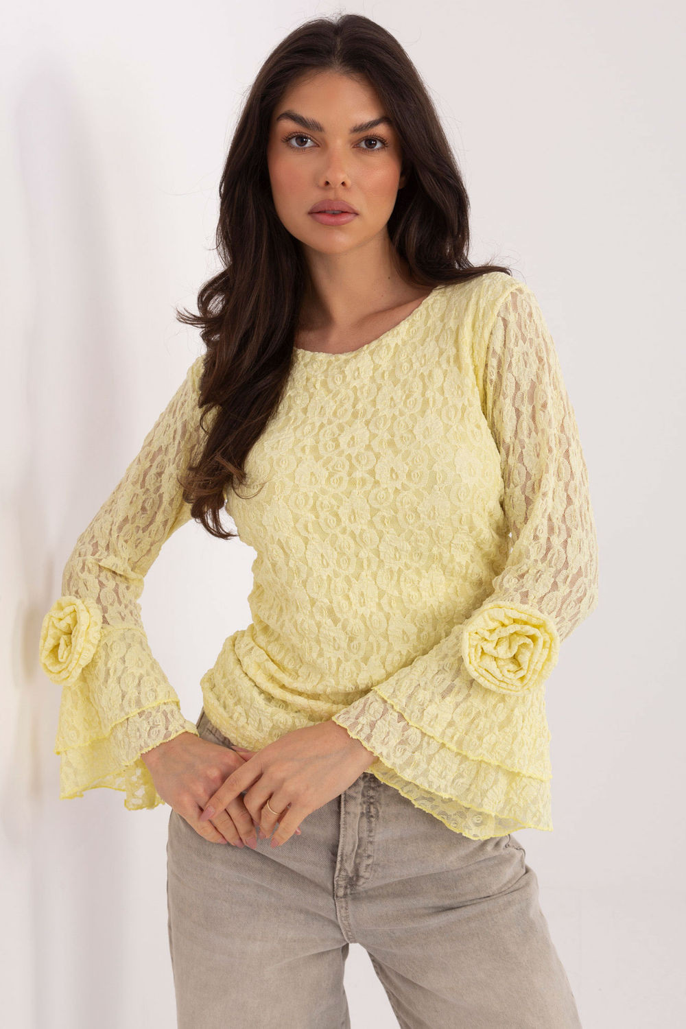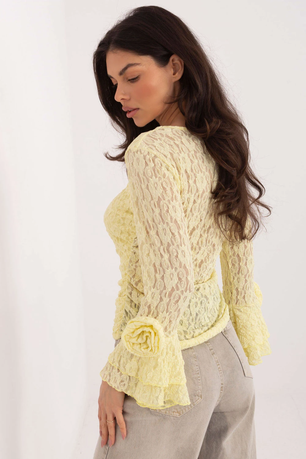 Elegantní krajková halenka je stylovým návrhem, který se skvěle hodí jak na speciální příležitosti, tak do každodenních outfitů. Vyrobená z vysoce kvalitního materiálu kombinujícího polyester s elastanem, poskytuje pohodlí a dobře padne k postavě. Různorodá textura materiálu dodává halence výjimečný charakter a decentní eleganci. Model s krátkou délkou, kulatým výstřihem a bez zapínání vypadá lehce a moderně. Dlouhé zvonové rukávy jsou zdobeny efektními volány a ozdobným látkovým kvítkem, které přitahují pozornost a dodávají celku romantický nádech. Přední část halenky má podšívku, zatímco rukávy a záda zůstávají jemně průhledné, zdůrazňujíce krajkový charakter modelu. Další sběry po stranách halenky decentně tvarují postavu. Halenka se skvěle hodí jako součást výstavního outfitu, na večírek, do práce, stejně jako do každodenního nošení, v kombinaci s kalhoty s vysokým pasem, sukní nebo elegantními džínsy.