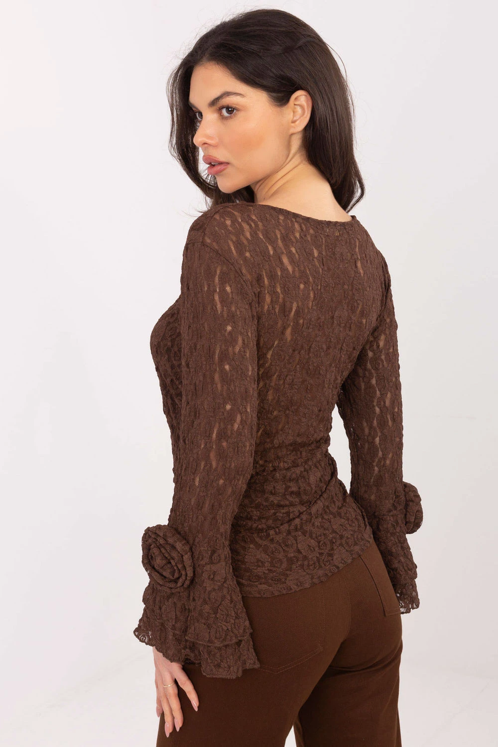 Elegantní krajková halenka je stylovým návrhem, který se skvěle hodí jak na výjimečné události, tak do každodenních outfitů. Vyrobená z materiálu vysoce kvalitního polyesteru s elastanem, poskytuje pohodlí nošení a dobře padne k postavě. Různorodá struktura materiálu dodává halence jedinečný charakter a jemnou eleganci. Model s krátkou délkou, kulatým výstřihem a bez zapínání působí lehce a moderně. Dlouhé zvonové rukávy jsou zdobeny efektními volány a ozdobným materiálovým květem, které přitahují pozornost a dodávají celku romantický nádech. Přední část halenky má podšívku, zatímco rukávy a záda zůstávají jemně průhledné, zdůrazňujíce krajkový charakter modelu. Další stahování po stranách halenky jemně modeluje postavu. Halenka se skvěle hodí jako součást stylového outfitu na návštěvu, večírek, do práce i do každodenního života, v kombinaci s kalhotami s vysokým pasem, sukní nebo elegantními džínami.