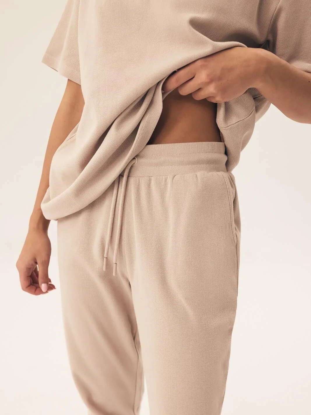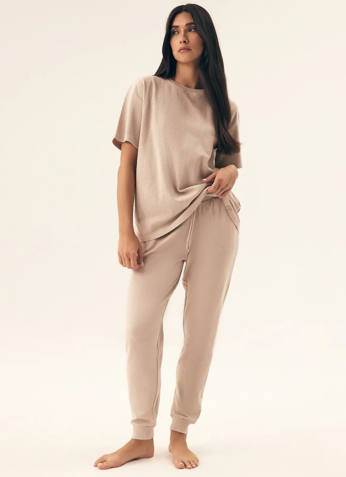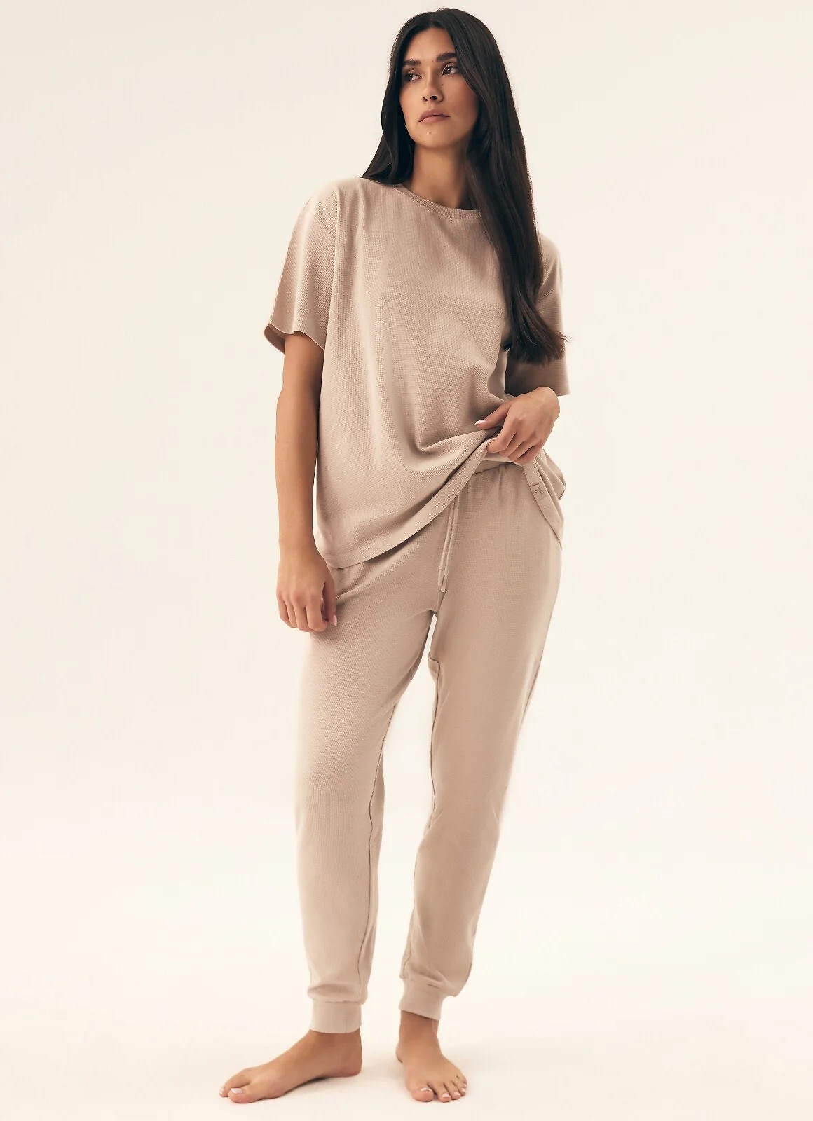 - široký elastický pas lemovaný žebrovaným úpletem se stahovací šňůrkou pro úpravu obvodu pasu
