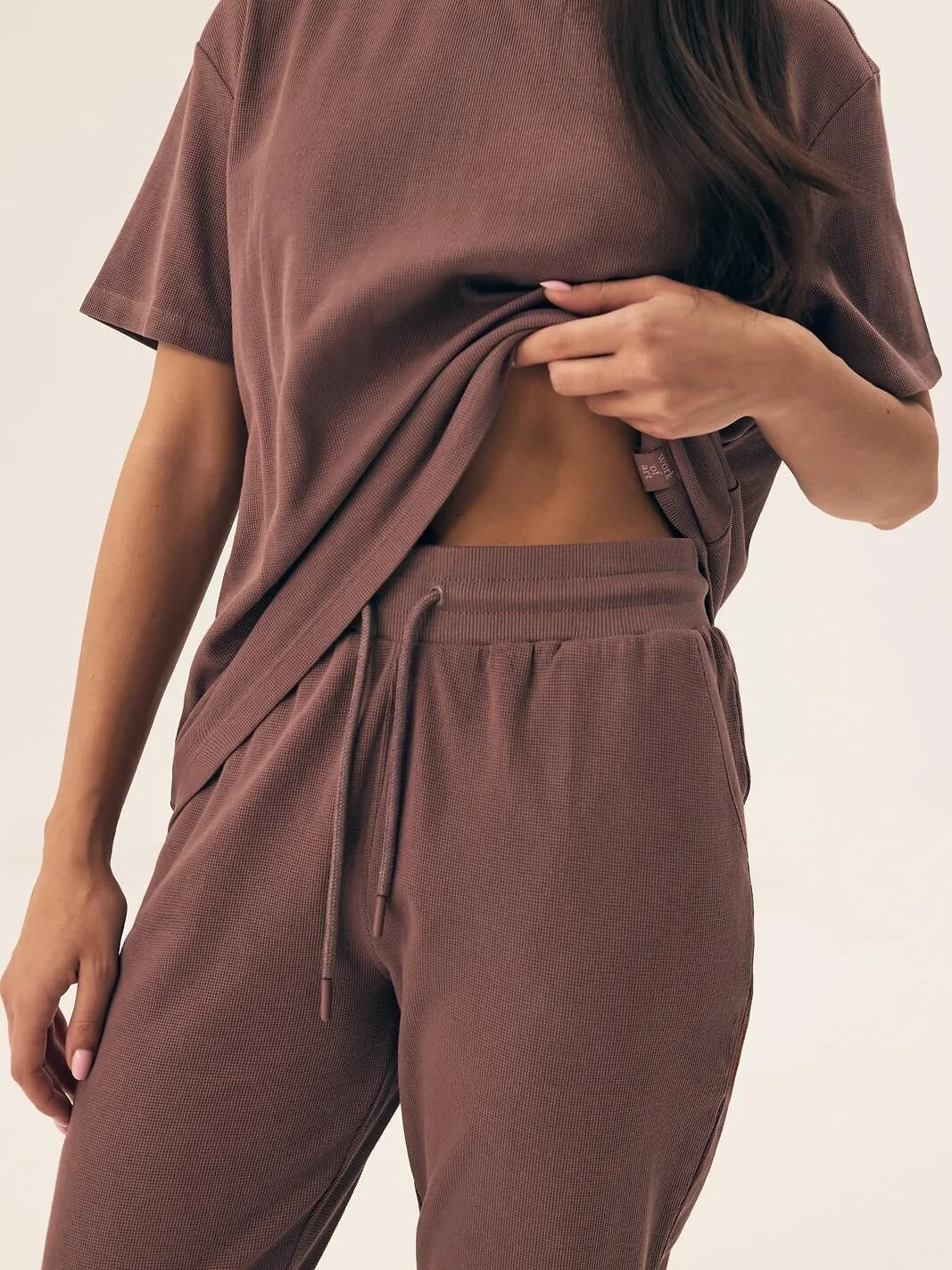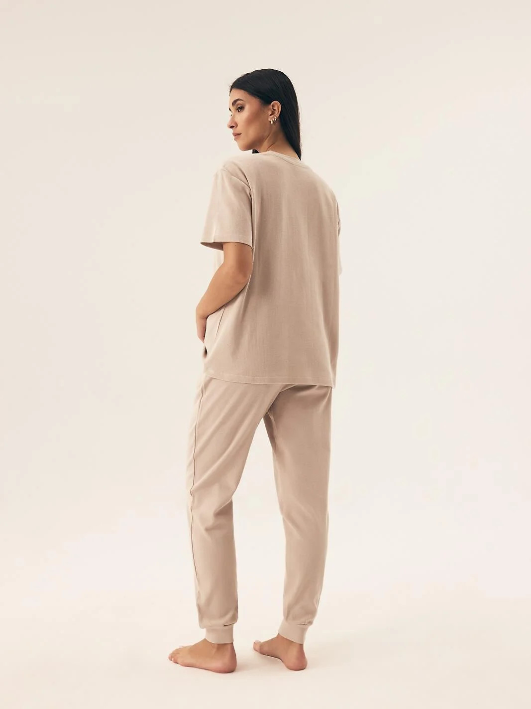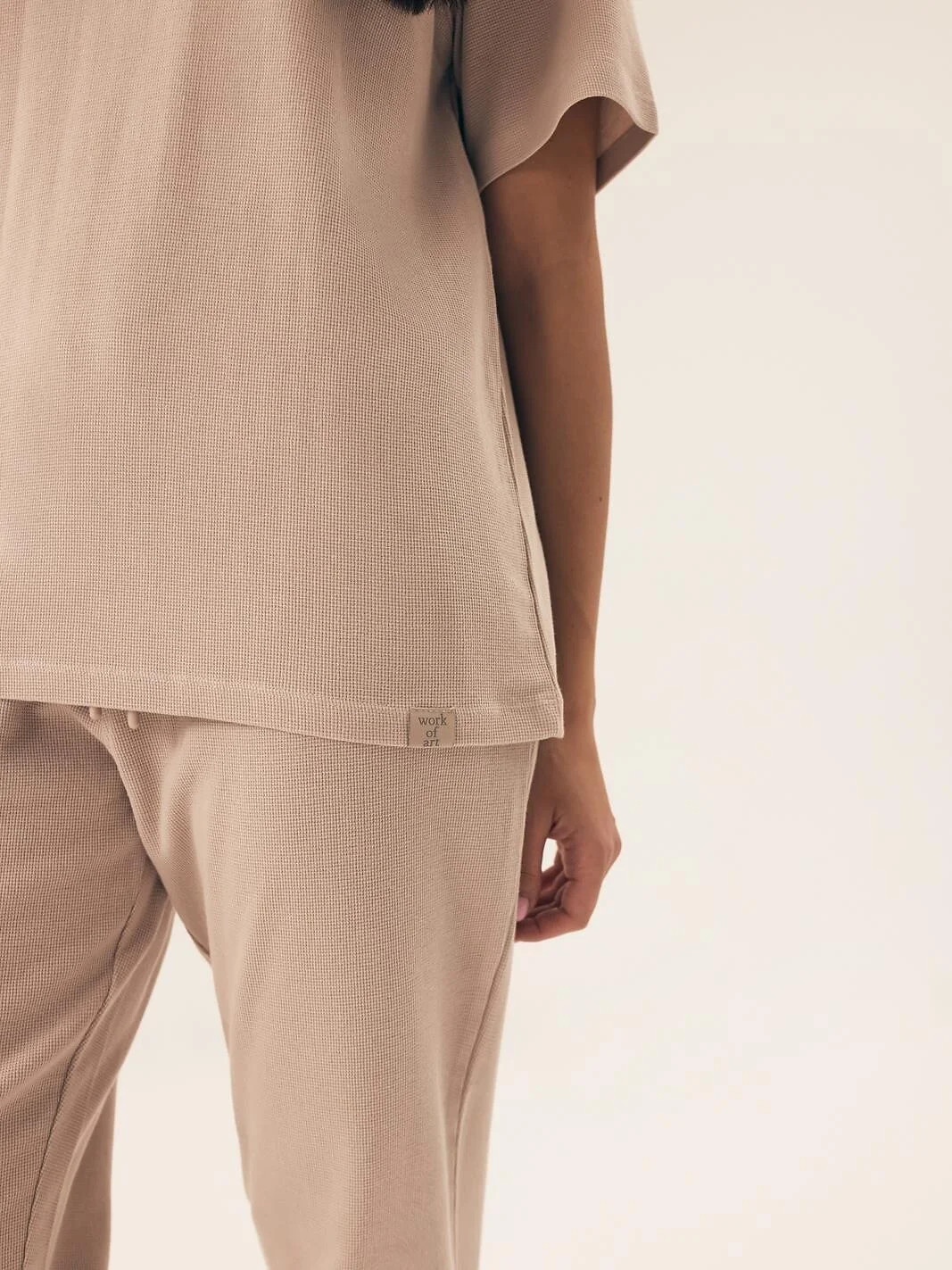 - široký elastický pas lemovaný žebrovaným úpletem se stahovací šňůrkou pro úpravu obvodu pasu