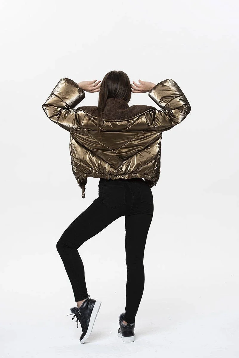 Bunda je lehce lesklá, má volný střih, je zateplená syntetickou péřovou výplní, má dvě kapsy a zapíná se zipem. Stojáček je zateplený beránkem. Na koncích rukávů jsou skryté stahovací lemy. Na spodním okraji modelu je stahující šňůrka. Model má délku do pasu.