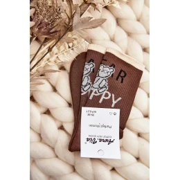Hnědé dámské bavlněné ponožky s nápisem a medvídkem