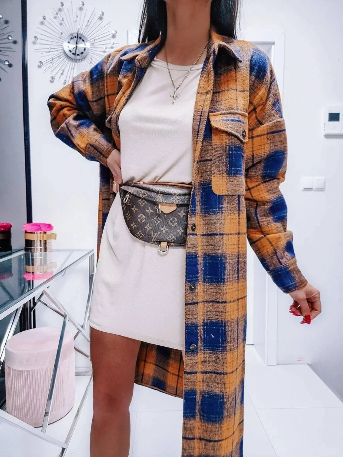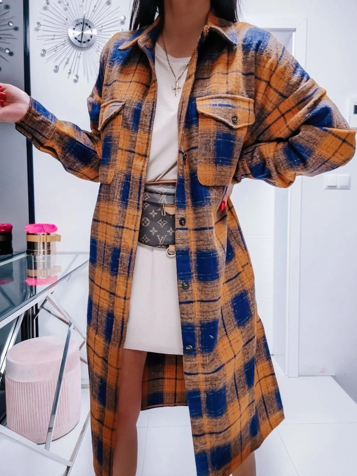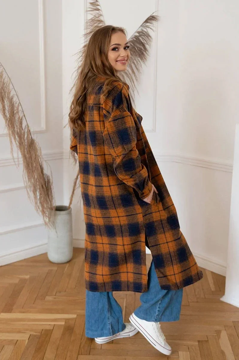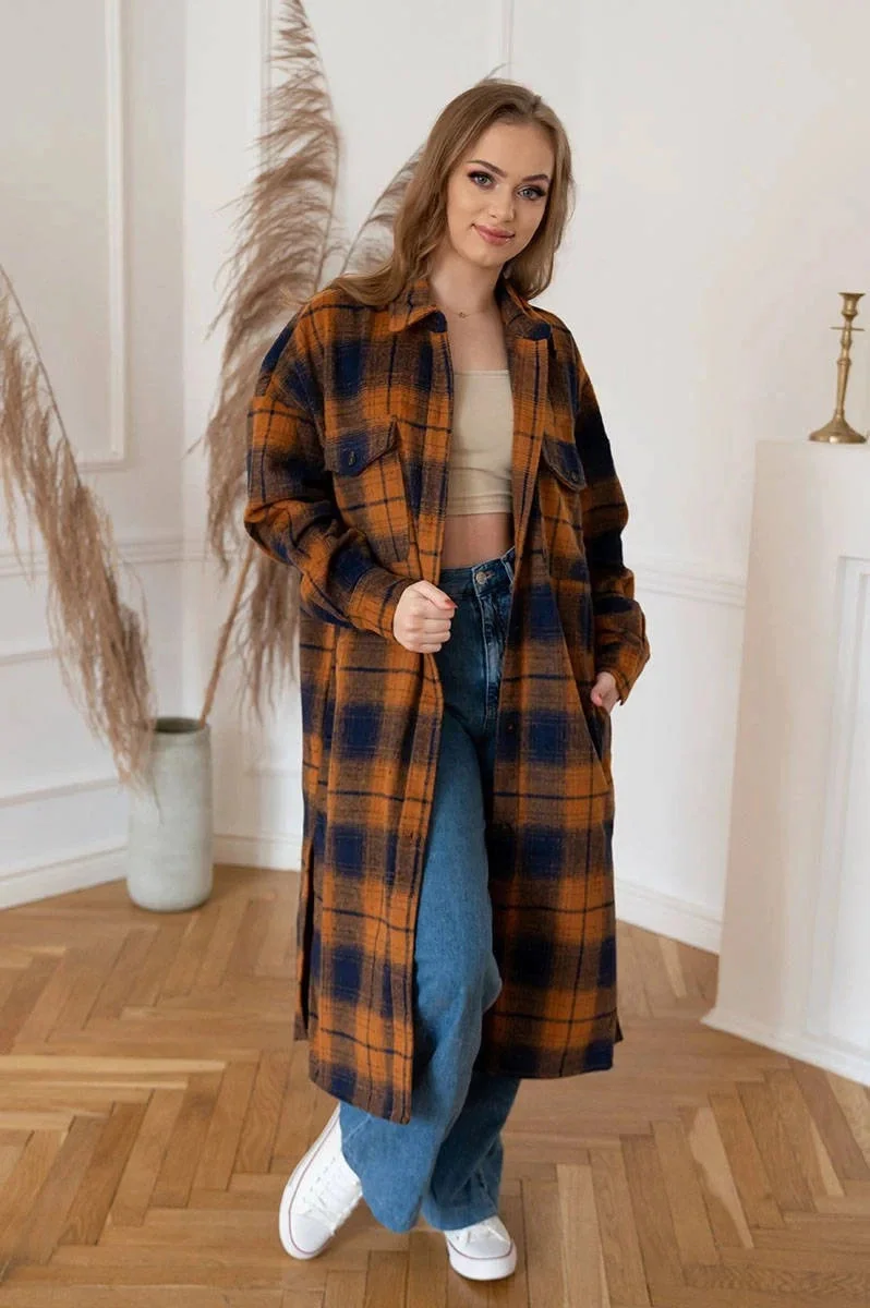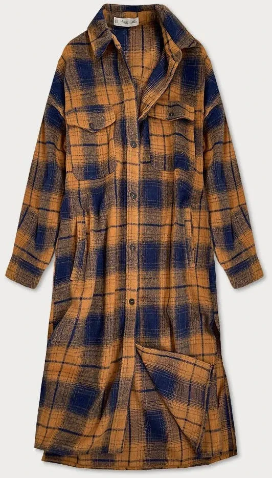 Přidání recenze k Hnědo-tmavě modrý dámský károvaný košilový kabát (8424)
