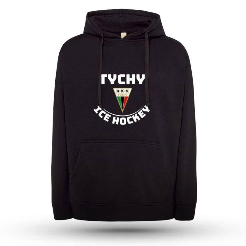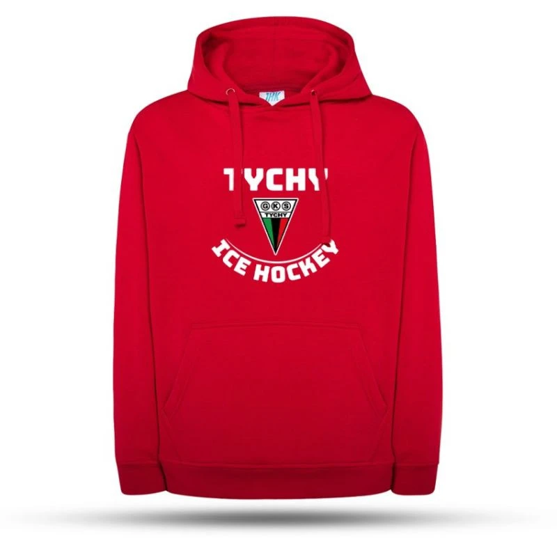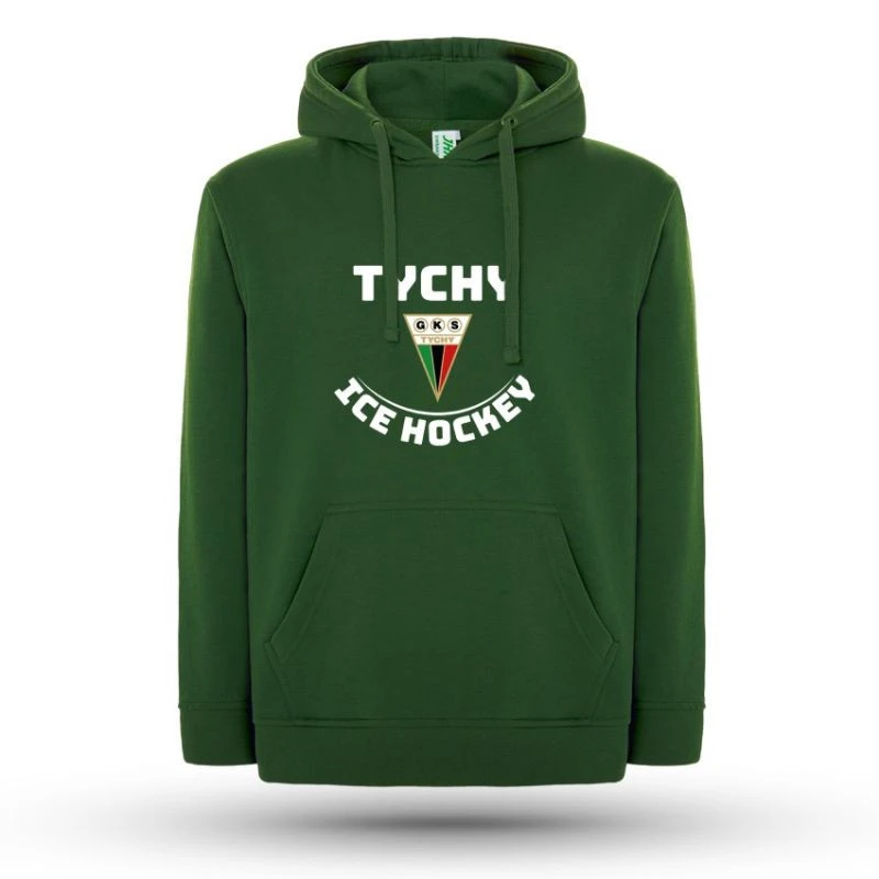 Bluza Ice Hockey GKS Tychy Stylowa bluza, która doskonale podkreśla Twoją pasję do hokeja i miłość do drużyny GKS Tychy. Idealna do noszenia na mecze i na co dzień, zapewnia komfort oraz ciepło, zachowując jednocześnie sportowy, dynamiczny wygląd. Główne cechy: Kaptur: Bluza z kapturem dla mężczyzn, wyposażona w pasujący sznurek do regulacji. Kieszeń kangurka: Naszyta kieszeń typu kangur do przechowywania drobnych przedmiotów lub ogrzewania rąk. Ściągacze: Elastyczne ściągacze 2x1 u dołu rękawów i bluzy, zapewniające idealne dopasowanie. Gramatura: 290 g/m², co zapewnia odpowiednią izolację cieplną i wygodę. Materiał: 65% poliester, 35% bawełna – gwarantujący trwałość i wygodę użytkowania. Grafika: personalizacja metodą DTF Nadruk DTF na odzieży Technologia DTF pozwala na drukowanie bezpośrednio na specjalnej folii, która następnie jest przenoszona na tkaninę za pomocą prasy termotransferowej. Dzięki temu uzyskujemy niesamowitą precyzję, żywe kolo