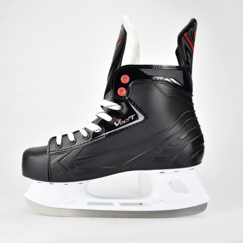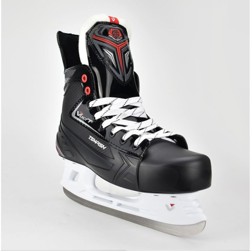 Łyżwy hokejowe TEMPISH VOLT-T Junior Komfort i trwałość dla graczy amatorskich Łyżwy hokejowe TEMPISH VOLT-T to idealny wybór dla amatorów poszukujących wygodnych i niezawodnych łyżew do rekreacyjnej gry i treningów. Dzięki trwałej konstrukcji, anatomicznemu dopasowaniu i solidnym materiałom, model VOLT-T zapewnia odpowiednie wsparcie i komfort nawet podczas dłuższych sesji na lodzie. Główne cechy: Trwała i stabilna konstrukcja: Cholewka wykonana z wytrzymałego kompozytu termoplastycznego Jednoczęściowa skorupa zwiększająca stabilność stopy Anatomiczny język z PVC i 9 mm warstwą filcu chroni przed uciskiem Komfort użytkowania: Wnętrze wyściełane miękkim nylonem CAMBRA Anatomicznie profilowana wkładka zapewniająca wygodne dopasowanie Piankowa wyściółka w okolicach kostki – większa ochrona i komfort Pewność i kontrola na lodzie: Ostrze TEMPISH 7000 ze stali nierdzewnej – trwałe i odporne na zużycie Klasyczny system sznurowania – łatwe dopasowanie do st