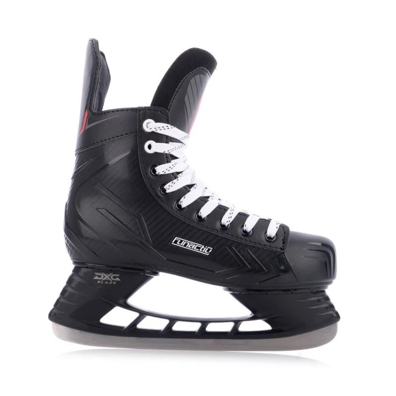 Łyżwy FunActiv DXG FunActiv DXG to łyżwy stworzone z myślą o graczach rekreacyjnych i miłośnikach hokeja, którzy poszukują trwałego, lekkiego i wygodnego modelu do regularnego użytku na lodzie. To idealne połączenie ochrony, komfortu i kontroli. Główne cechy: Wytrzymała skorupa kompozytowa: Solidna konstrukcja z odpornego na uderzenia kompozytu skutecznie amortyzuje kontakt z krążkiem lub kijem, jednocześnie zachowując niską wagę dla lepszej zwrotności. Anatomicznie ukształtowany język: Dwuczęściowy język ze średnio sztywnym wzmocnieniem wewnętrznym dopasowuje się do podbicia i kostki, zapewniając wygodę oraz stabilność podczas jazdy i gry. Uniwersalne zastosowanie: Model odpowiedni zarówno do jazdy rekreacyjnej, jak i amatorskich treningów czy meczów na niższym poziomie. FunActiv DXG to wszechstronne łyżwy dla osób, które chcą cieszyć się pewną i komfortową jazdą, korzystając ze sprawdzonego sprzętu sportowego. Specyfikacja techniczna – Łyżwy